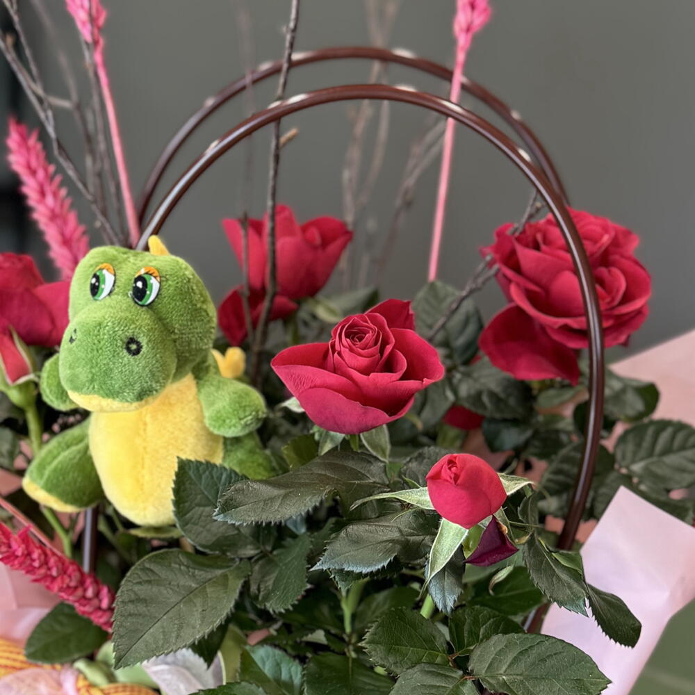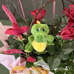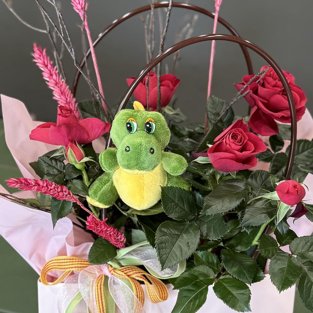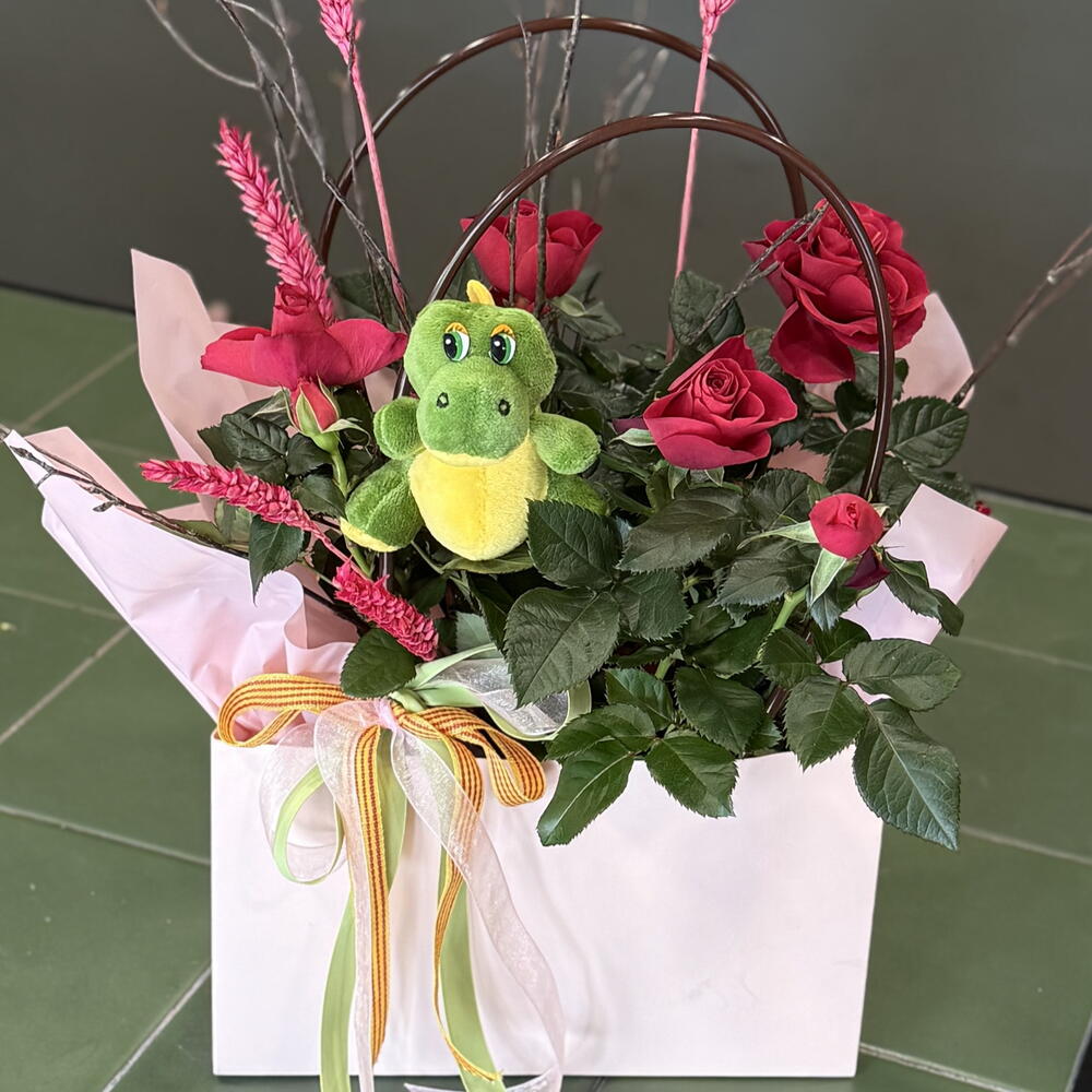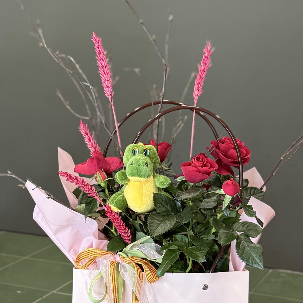 Rosa en maceta en una bolsa decorativa de plástico, práctica para su cuidado. Peluche de dragón, espigas y ramitas. Cinta con la bandera catalana. Un regalo ideal para quienes disfrutan cuidando plantas