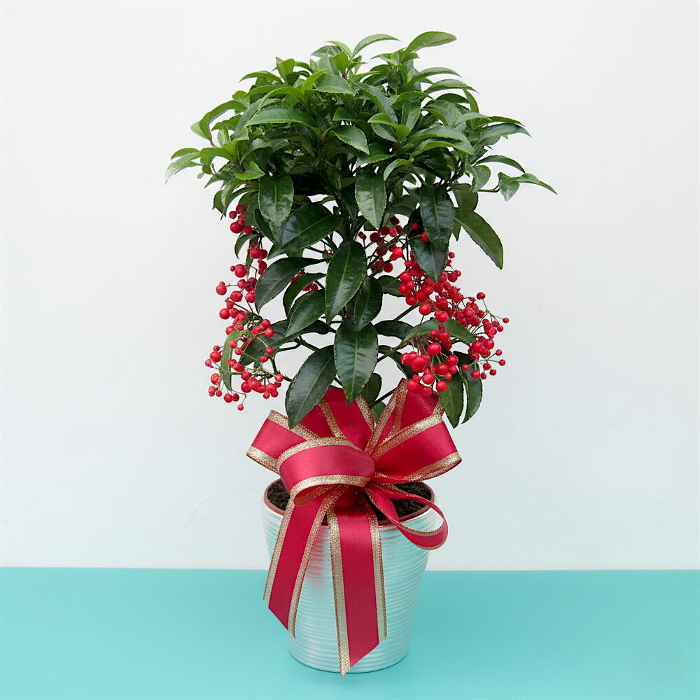Está adornado con un gran lazo rojo con bordes dorados, ideal para regalar en