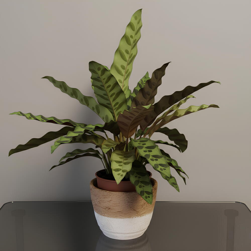 La planta en la imagen es una Calathea lancifolia, también conocida como planta serpiente o rattlesnake plant por sus hojas alargadas con patrones oscuros parecidos a huellas. Es una planta tropical popular por su follaje exótico que aporta un toque vibrante y elegante a cualquier espacio interior.