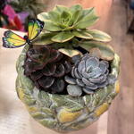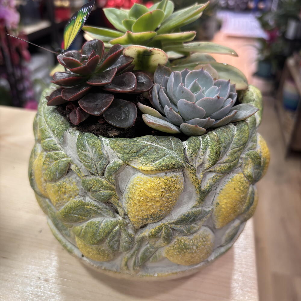 Cerámica con relieves de limones, decorado con 3 suculentas, ideal para regalar y presidir el centro de la mesa.