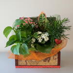 Arreglo en cesta con plantas naturales de interior, que combina follaje verde intenso con plantas florales y un toque de color gracias al croton. Una composición viva, decorativa y duradera, ideal para regalar en aniversarios, celebraciones o para dar vida a cualquier espacio interior. Pothos (Epipremnum aureum) – 1 ud Kalanchoe blanco – 1 ud Kalanchoe rosa – 1 ud Croton – 1 ud Palmera de interior (tipo Chamaedorea) – 1 ud Verde decorativo Cesta decorativa – 1 ud Corazón decorativo rojo – 1 ud