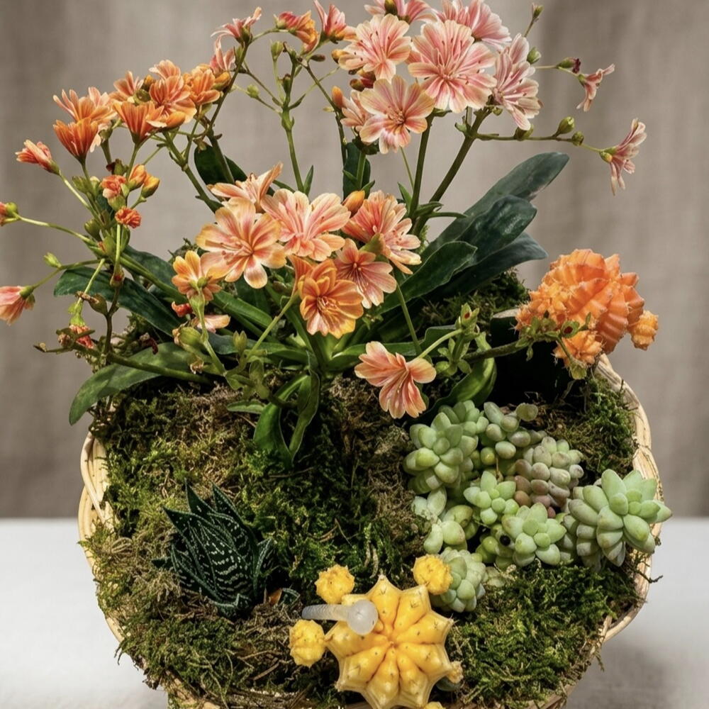 Esta encantadora cesta de plantas es una excelente opción para aquellos que buscan un toque de naturaleza y color en su hogar sin la necesidad de un cuidado intensivo. Aquí te detallamos todo sobre esta cesta: Plantas: • Suculentas: La cesta presenta una variedad de suculentas, plantas que se caracterizan por sus hojas carnosas y su capacidad para almacenar agua. • Cactus de colores: En la cesta también encontramos 3 pequeños cactus, uno amarillo,otro naranja y uno verde. Cesta: • La cesta está hecha de mimbre, un material natural y duradero que le da un toque rústico y acogedor. Su diseño tradicional y su color natural encajan perfectamente en cualquier estilo de decoración.