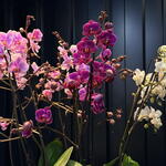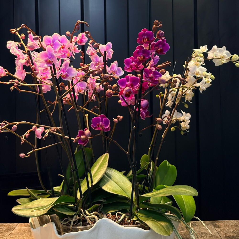 Composición de orquídeas Phalaenopsis en tonos rosa y fucsia, presentada en una maceta blanca de líneas suaves, acompañada de jarrones de cerámica que aportan un acabado elegante y contemporáneo. Las varas florales se elevan de forma armoniosa, combinando flores abiertas y capullos que aportan movimiento y una sensación de continuidad en la floración. El contraste entre el verde intenso de las hojas y los matices vibrantes de las orquídeas crea una pieza sofisticada y luminosa, ideal para dar un toque moderno y refinado a cualquier espacio.
