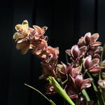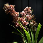 Orquídea cymbidium en tonos rosa malva con varas largas y floración abundante. Una planta elegante y llamativa para interiores amplios.