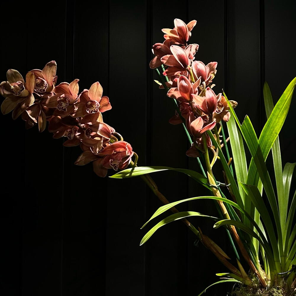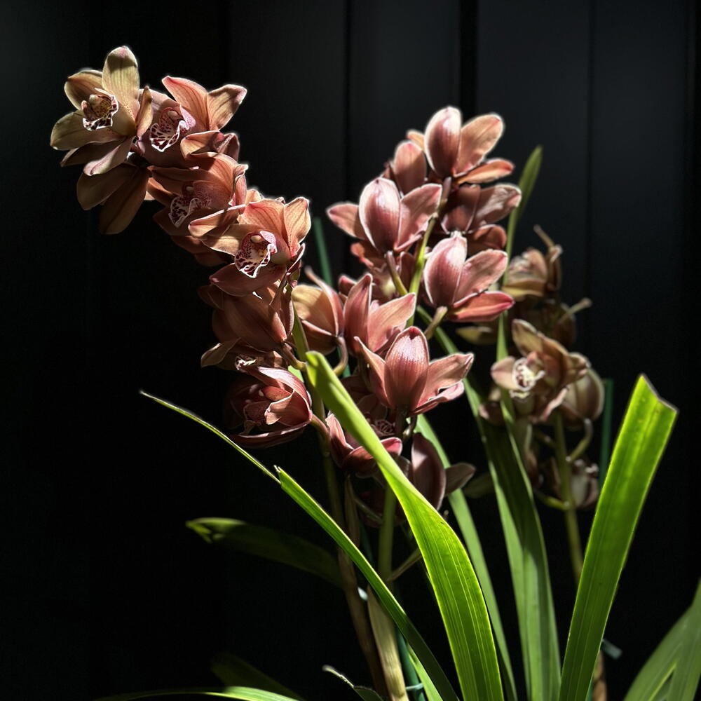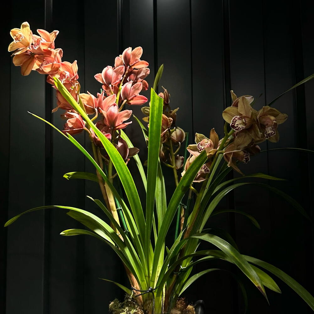 Orquídea cymbidium en tonos rosa malva con varas largas y floración abundante. Una planta elegante y llamativa para interiores amplios.