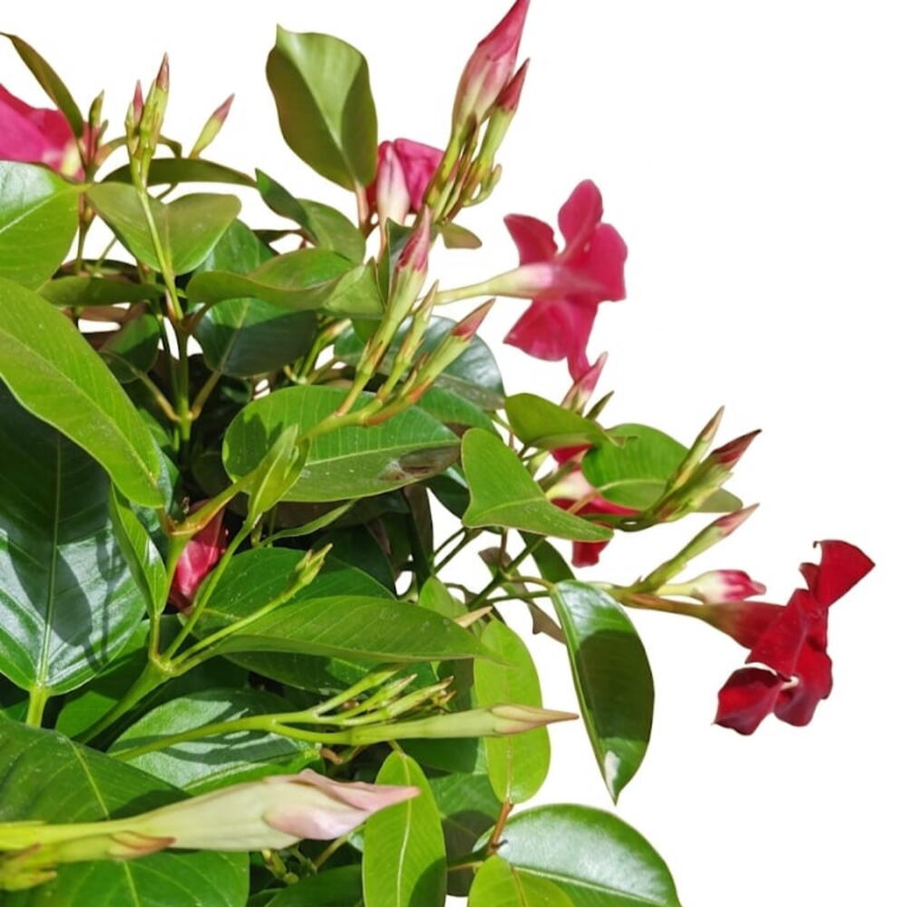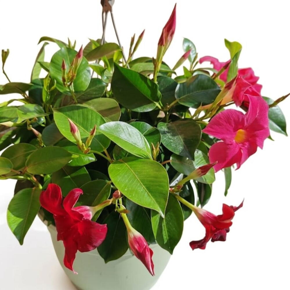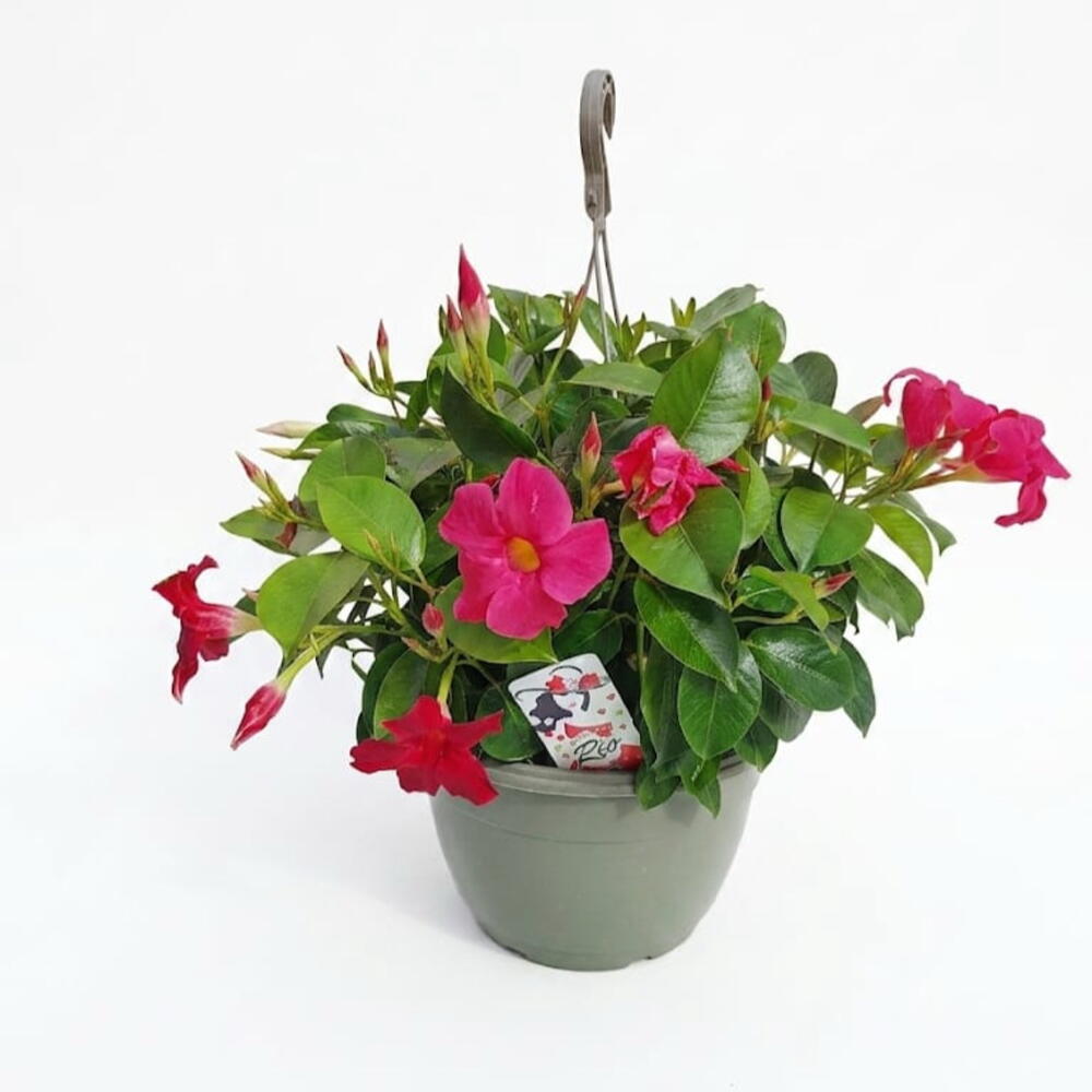 Hermosa Diplademia con flores, en macetero para colgar y disfrutar de flores, florecen durante primavera, verano y otoño