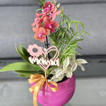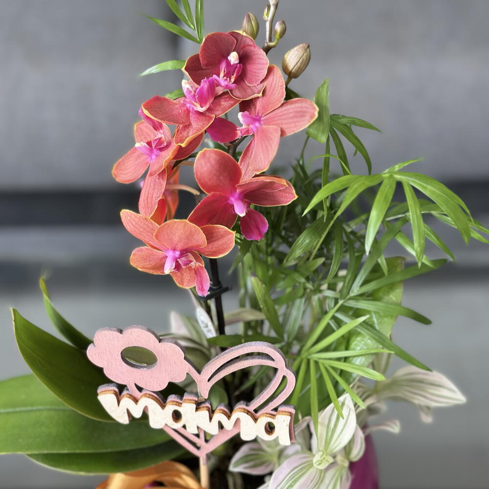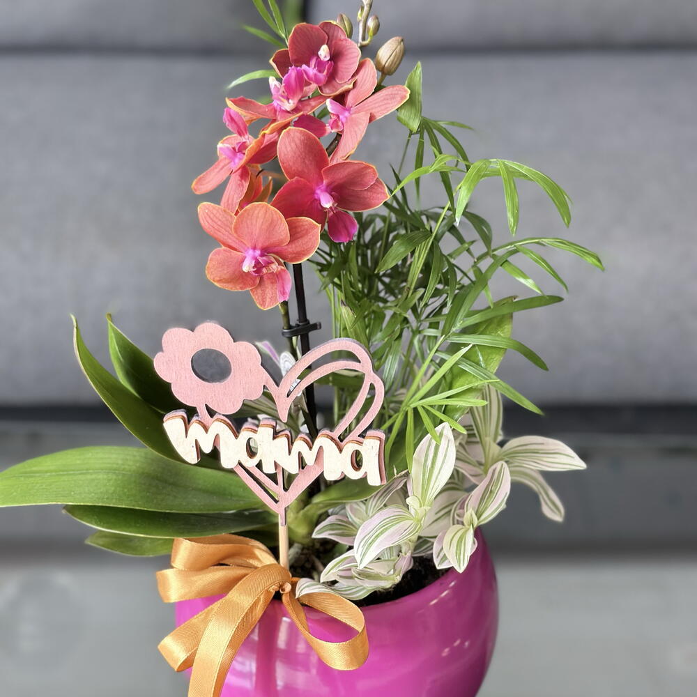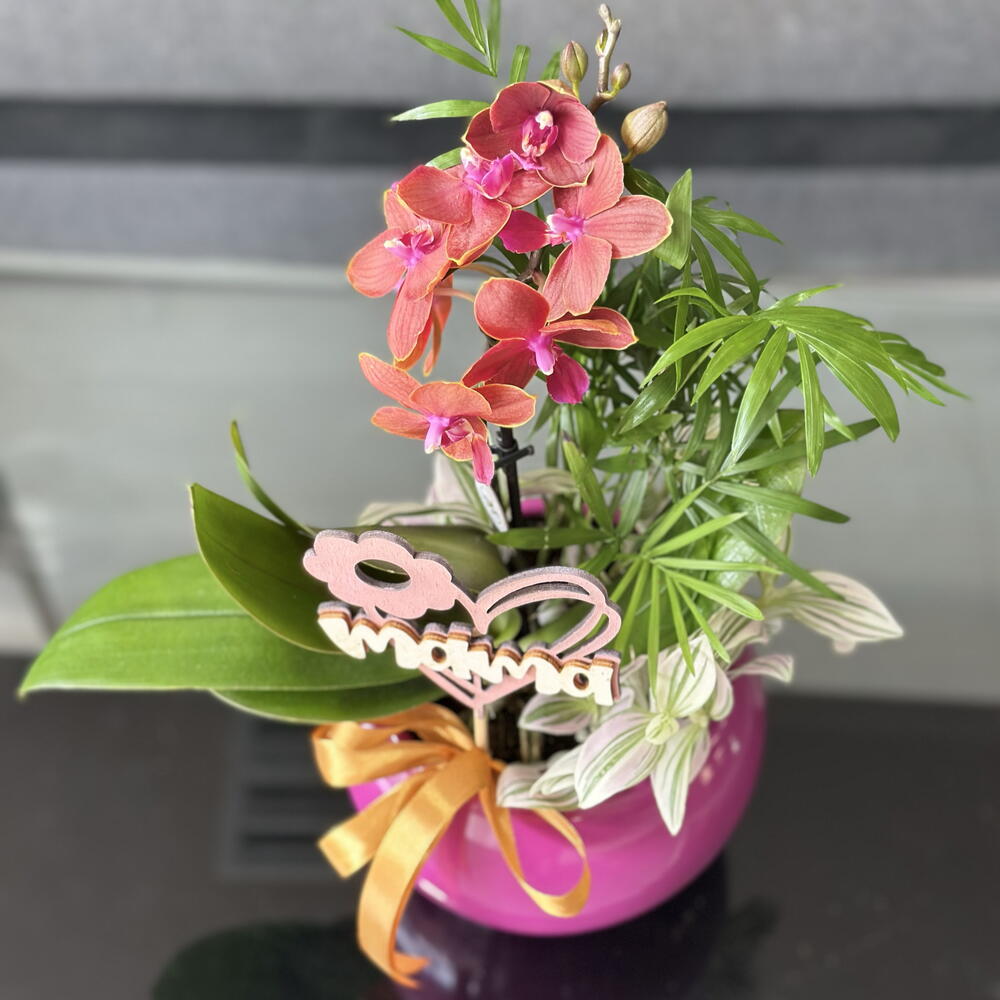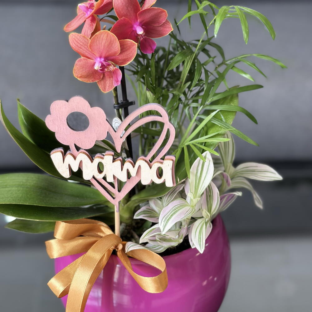 Centro de la mesa en un jarrón de cerámica de color fucsia con plantas. Con las siguientes plantas: mini orquídea phalaenopsis, tradescantia, chamadorea elegans. Con topper de madera para el Dia de la Madre. Todas las plantas se transplantaros en el substrato y hay drenaje en el fondo de la maceta.