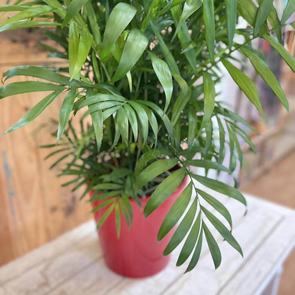 Planta de interior conocida como Palma de salón (Chamaedorea elegans). Ideal para espacios interiores con luz indirecta. Fácil mantenimiento.