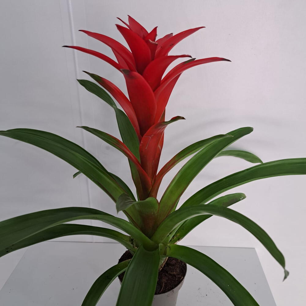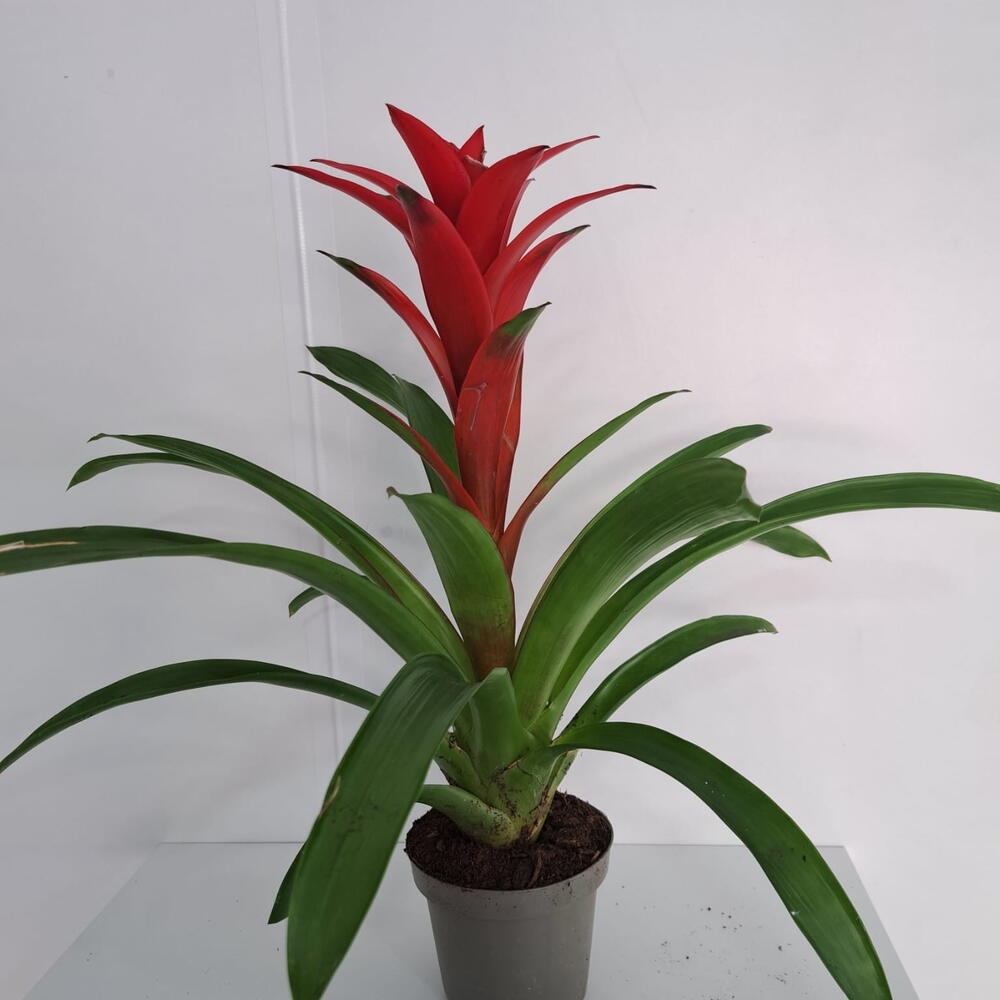 La Guzmania es una elegante planta tropical perteneciente a la familia de las bromelias, muy apreciada por su espectacular floración y su aspecto exótico. Sus largas hojas verdes forman una roseta natural desde la que emerge una inflorescencia brillante en tonos rojos, naranjas o amarillos, que puede mantenerse decorativa durante varios meses. Gracias a su forma compacta y a sus colores intensos, la guzmania es perfecta para decorar interiores, oficinas o regalar en ocasiones especiales. Además, aporta un toque fresco y tropical a cualquier espacio sin requerir cuidados complicados.