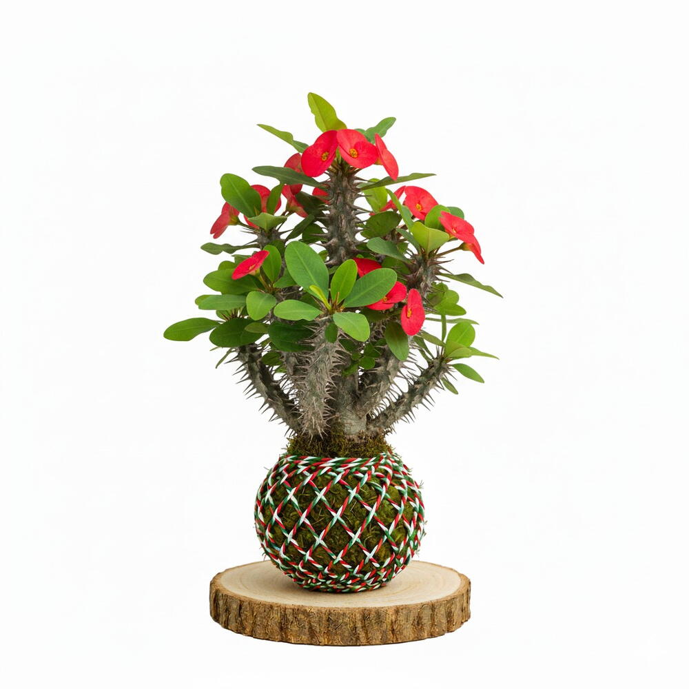 Kokedama de Espina de Cristo: Planta resistente y muy decorativa, con tallos espinosos y flores duraderas. Ideal para espacios muy luminosos, aporta un toque exótico y colorido con cuidados sencillos y riego moderado.