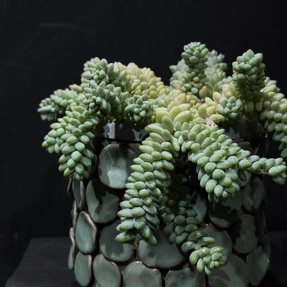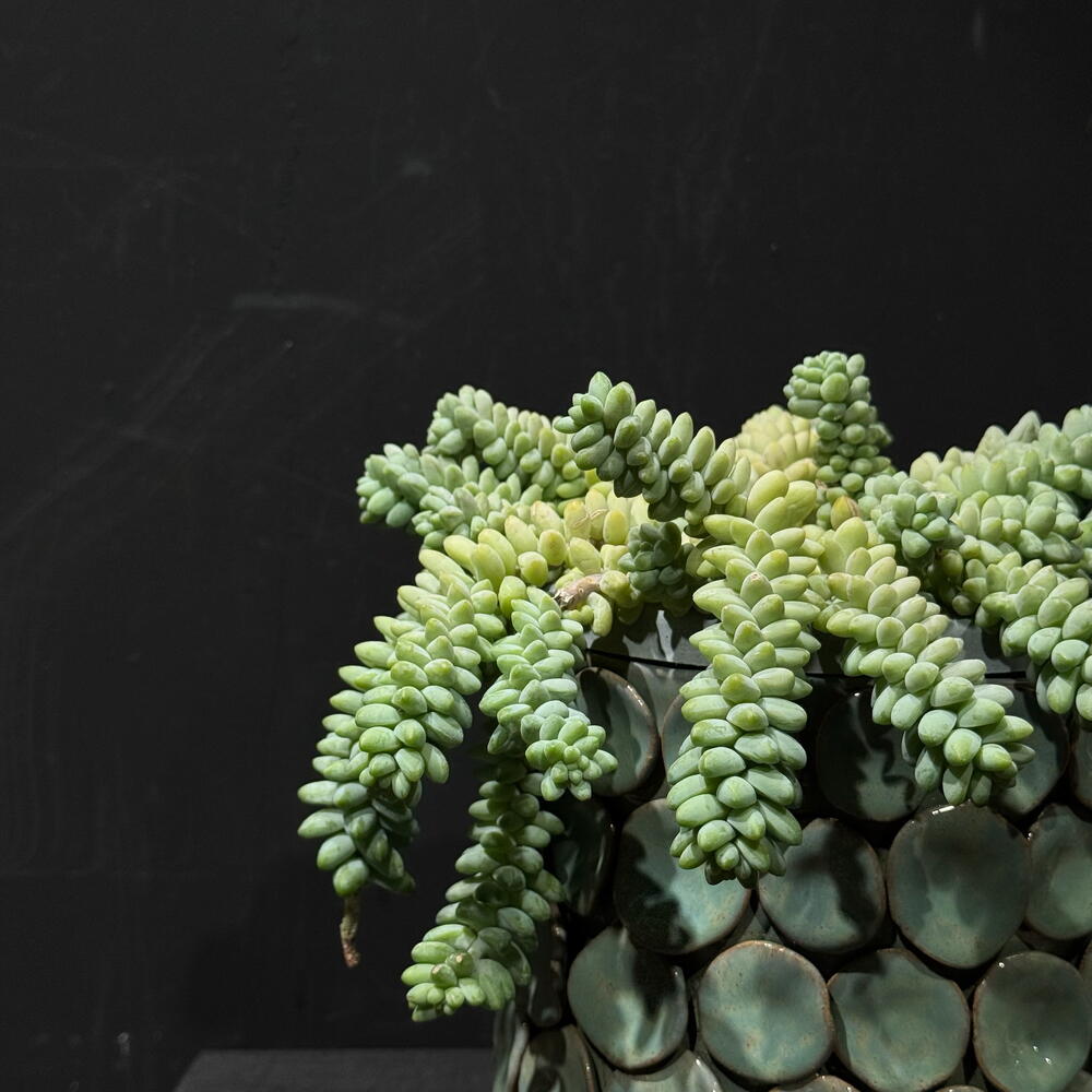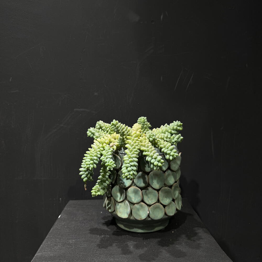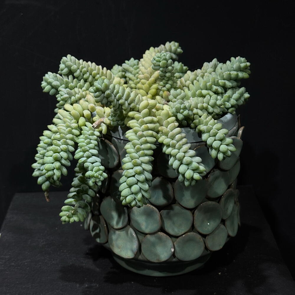 Suculenta colgante en elegante maceta decorativa, perfecta para dar un toque moderno y natural a cualquier espacio. Fácil de cuidar y ideal para interiores. Las dimensiones de la maceta: 16x16cm. La planta es: Sedum burrito colgante. *La maceta y la planta se venden también por separado.