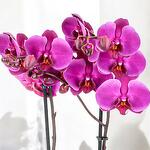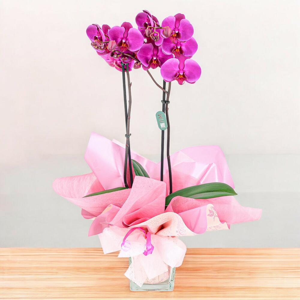 Planta de orquidea phalaenopsis color magenta de dos tallos, envuelta con un papel y un lazo decorativo en una base de cristal.