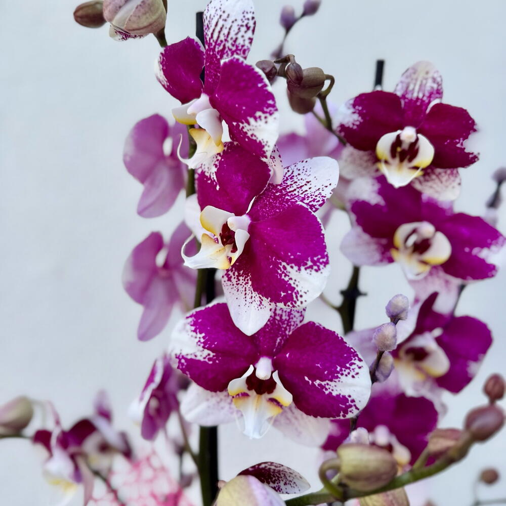 •. Luz: Brillante e indirecta; evitar el sol directo. • Agua: Regar cada 7–10 días cuando las raíces se vuelvan plateadas; evitar el suelo encharcado. • Humedad: Prefiere 50–70% de humedad; pulverizar ocasionalmente si es necesario. • Temperatura: Mantener entre 18–25°C (65–77°F); evitar corrientes de aire. • Fertilizante: Usar fertilizante para orquídeas cada 2–4 semanas durante el crecimiento. • Trasplante: Cada 1–2 años en sustrato fresco de corteza para orquídeas. • Después de la floración: Recortar la vara floral por encima de un nodo para fomentar una nueva floración.