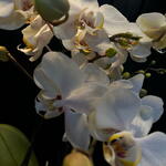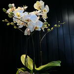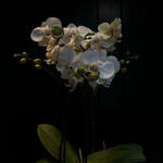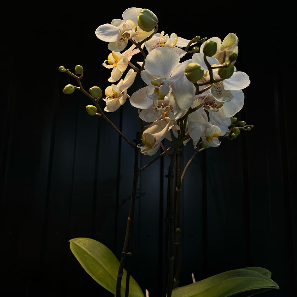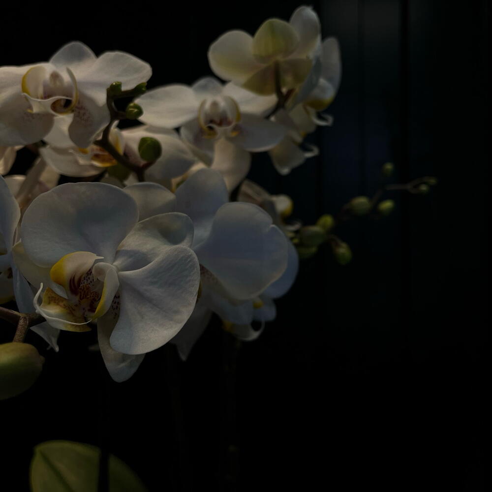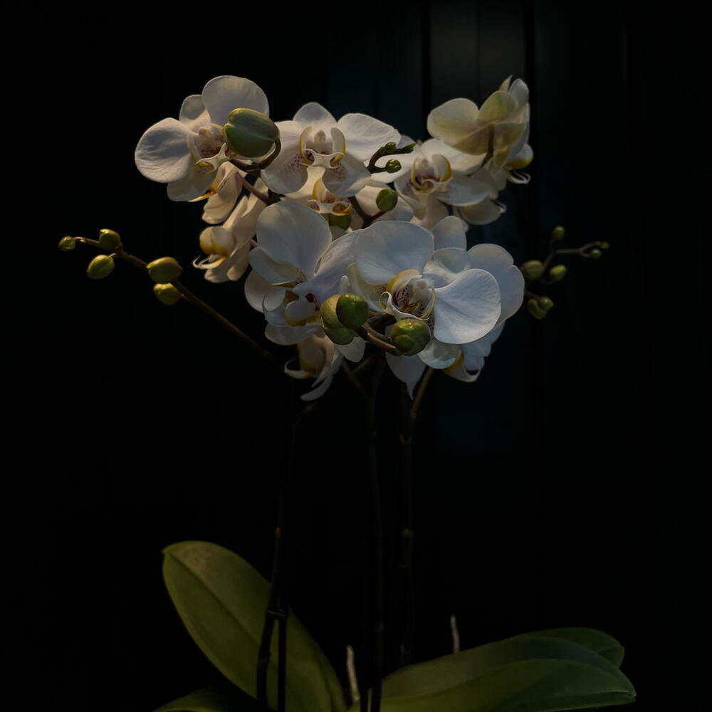 Esta orquídea parece una constelación blanca suspendida en la sombra: flores suaves como nubes, brotes verdes listos para despertar y un porte elegante que ilumina incluso la oscuridad. Una belleza que no hace ruido, pero domina la escena.
