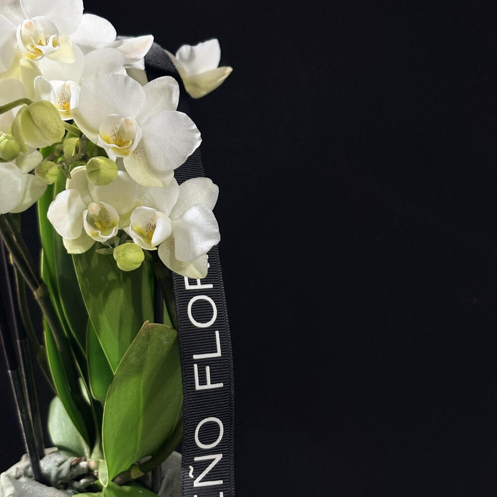 Una pequeña orquídea blanca despliega su belleza con una elegancia silenciosa. Sus pétalos, delicados y luminosos, parecen hechos de porcelana fina, reflejando la luz con una suavidad casi etérea. A pesar de su tamaño mini, la flor posee una presencia sorprendente: ligera, equilibrada y llena de encanto natural.