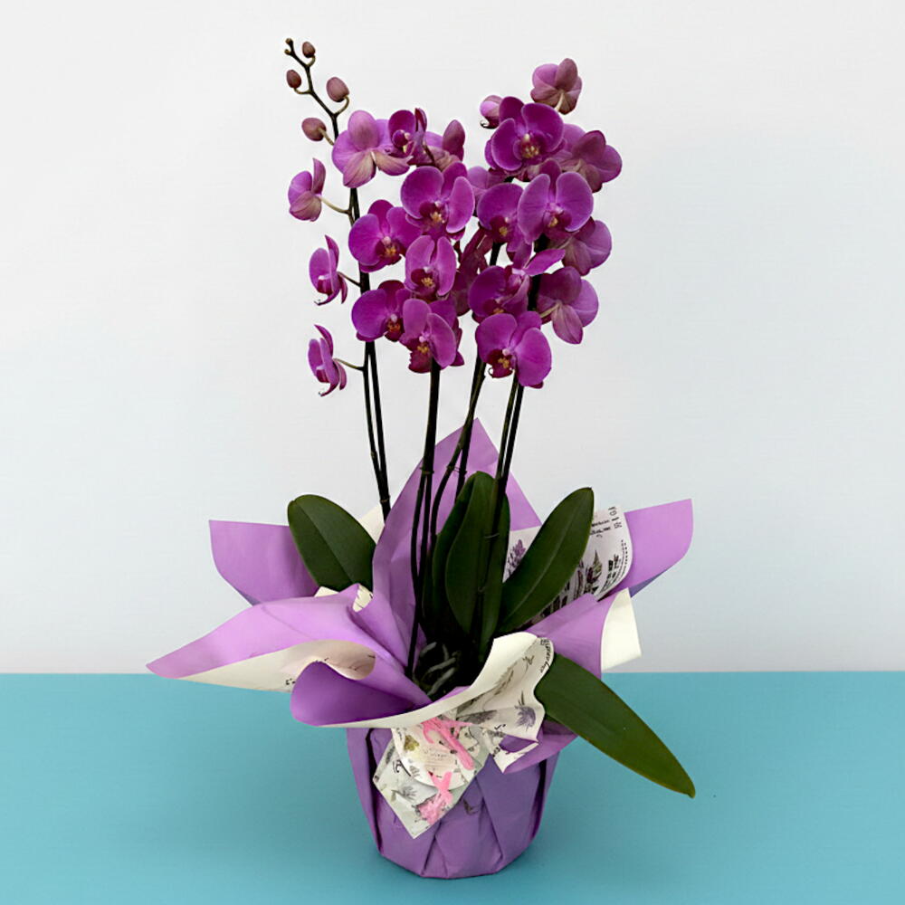 Esta hermosa composición floral presenta una elegante Phalaenopsis de color violeta intenso, también conocida como orquídea mariposa. Está cuidadosamente envuelta en papel decorativo en tonos lavanda y blanco, lo que la convierte en un regalo sofisticado y lleno de vida.