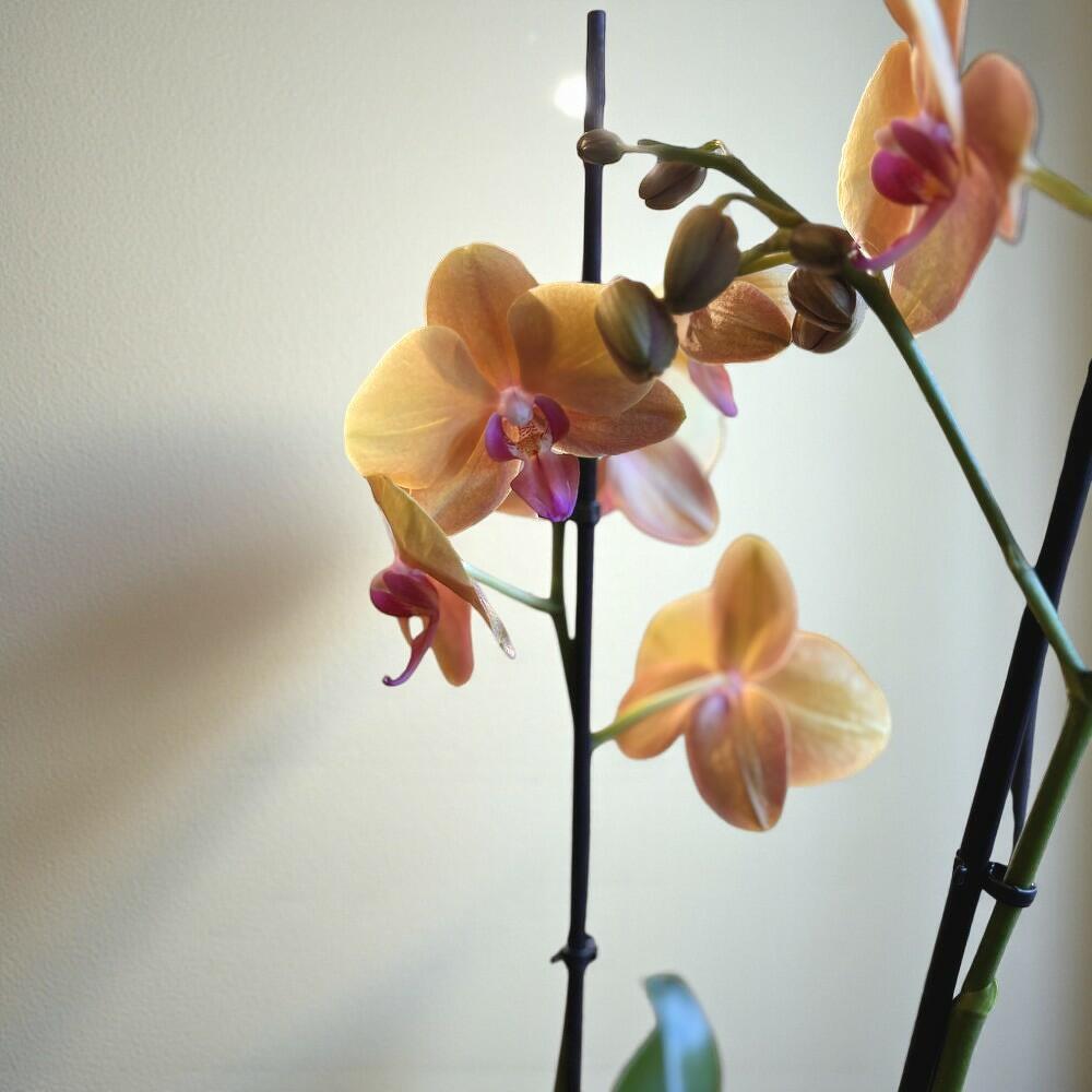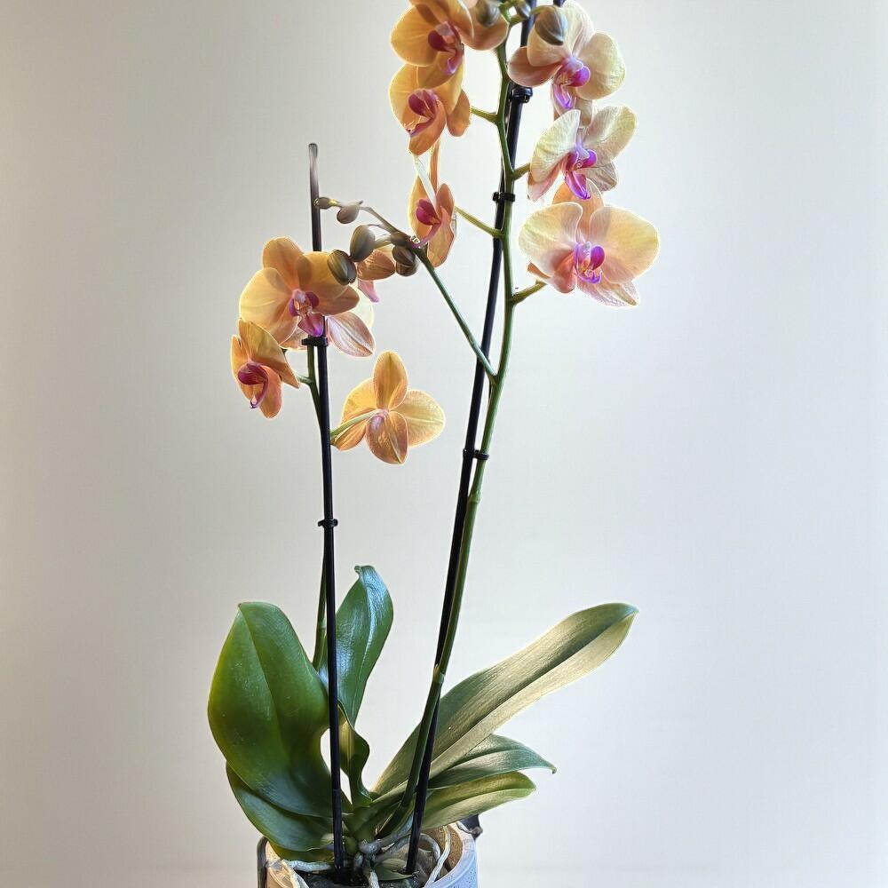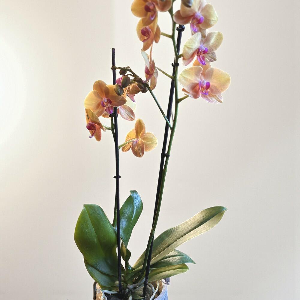 Orquídea Phalaenopsis en un delicado tono durazno con matices rosados y centro fucsia. Sus flores elegantes y exóticas crean un ambiente sereno y sofisticado, perfecta para decorar salas, oficinas o para regalar en ocasiones especiales.