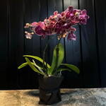 Una orquídea púrpura llena de puntitos brilla como un pequeño universo en flor. Sus hojas verdes la sostienen firme, mientras la maceta negra la envuelve como si fuera un regalo elegante.