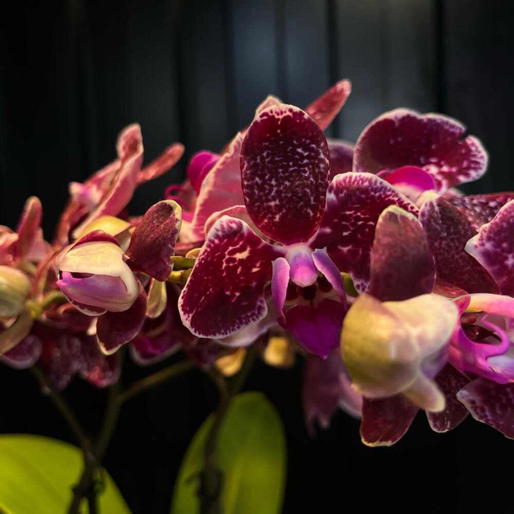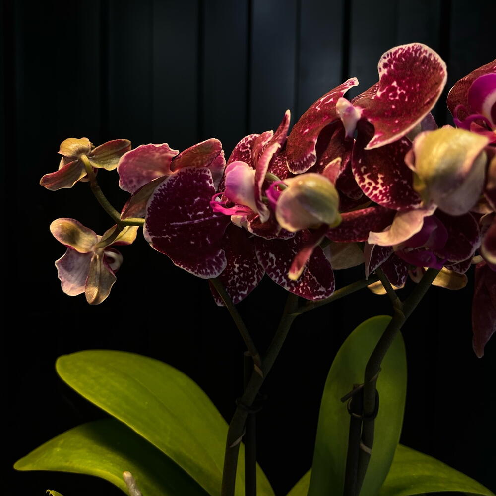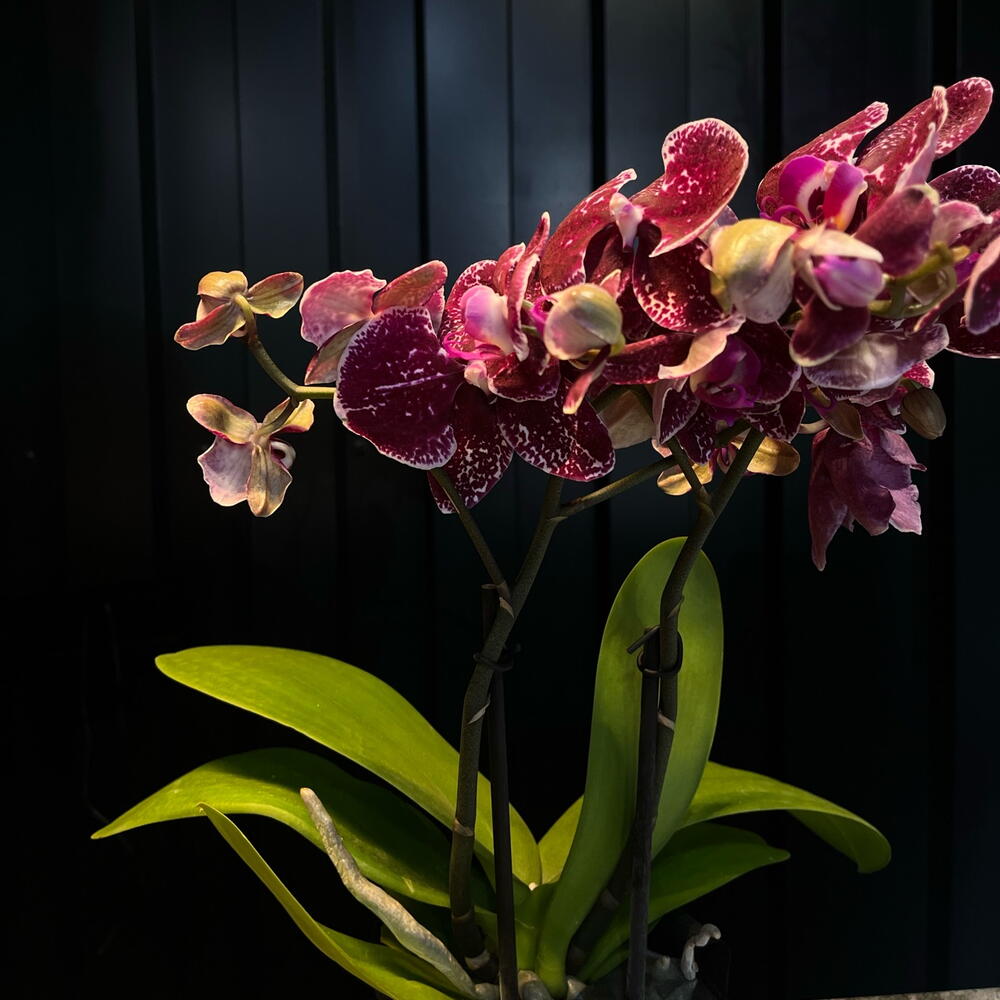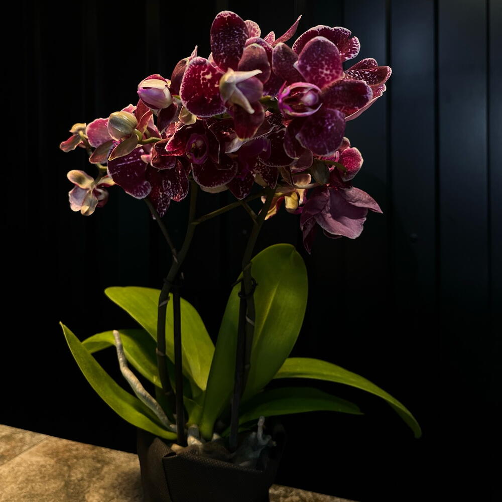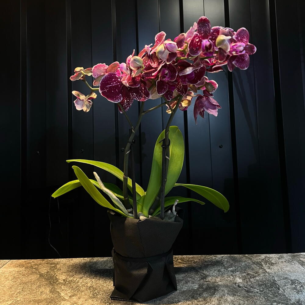 Una orquídea púrpura llena de puntitos brilla como un pequeño universo en flor. Sus hojas verdes la sostienen firme, mientras la maceta negra la envuelve como si fuera un regalo elegante.