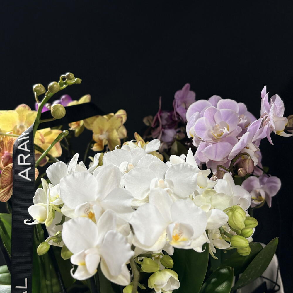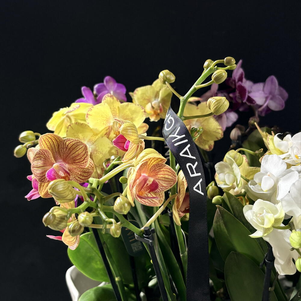 En el centro de la composición descansa un jarrón de cerámica blanca, de superficie suave y luminosa, cuya sencillez permite que la mirada se concentre en la verdadera protagonista de la escena: un delicado conjunto de 6 orquídeas. La cerámica, de un blanco puro y sereno, refleja suavemente la luz y crea una sensación de calma y equilibrio que envuelve toda la pieza. No hay exceso ni artificio; solo la elegancia tranquila de los objetos bien elegidos.