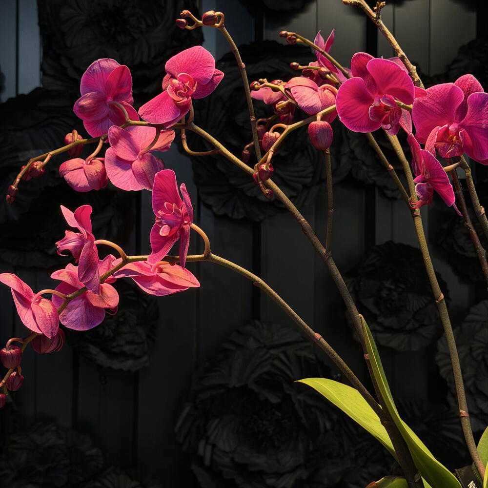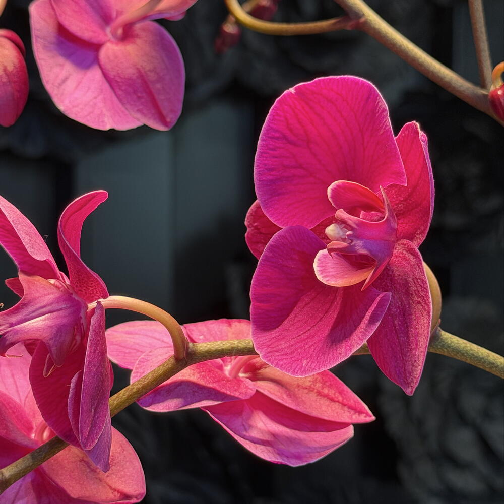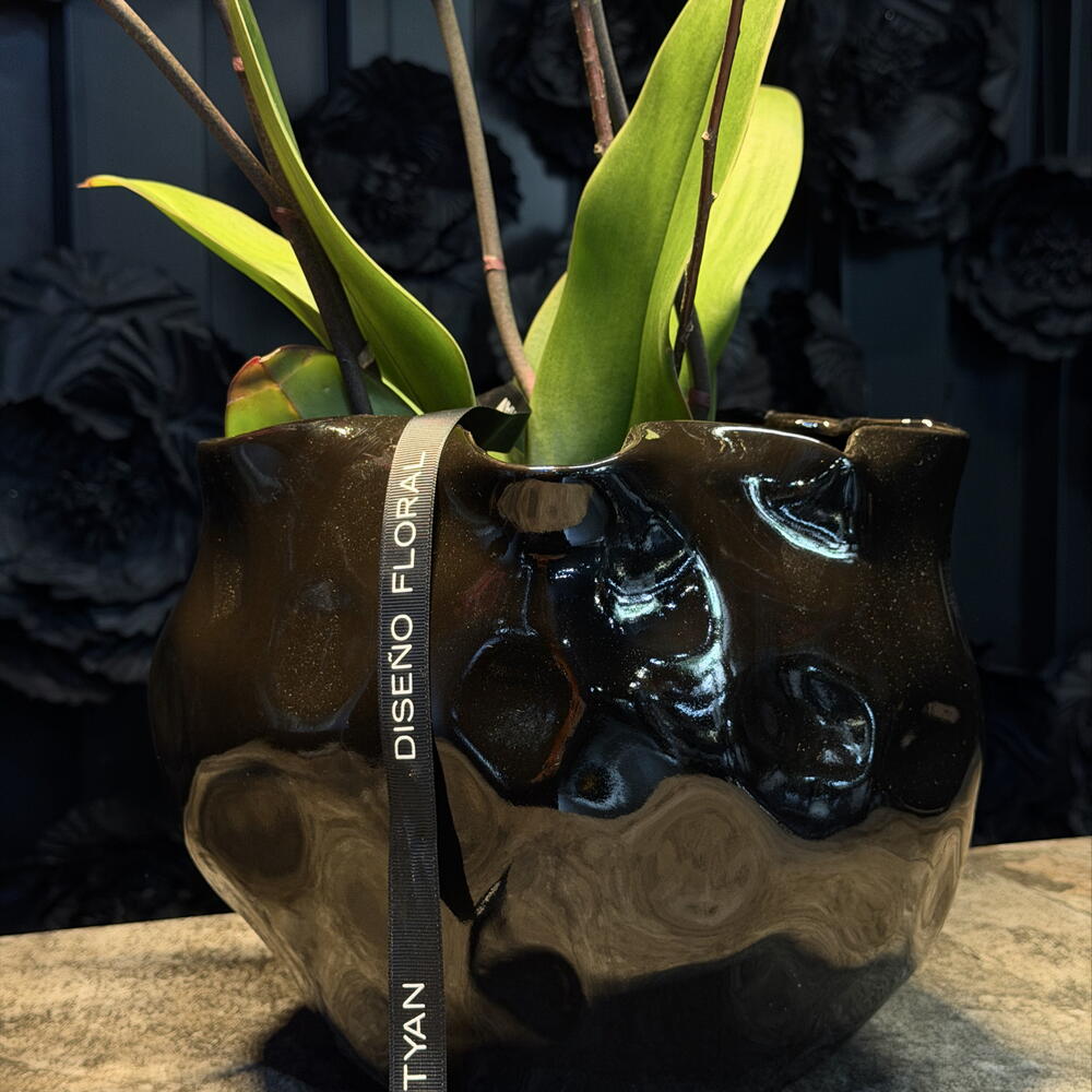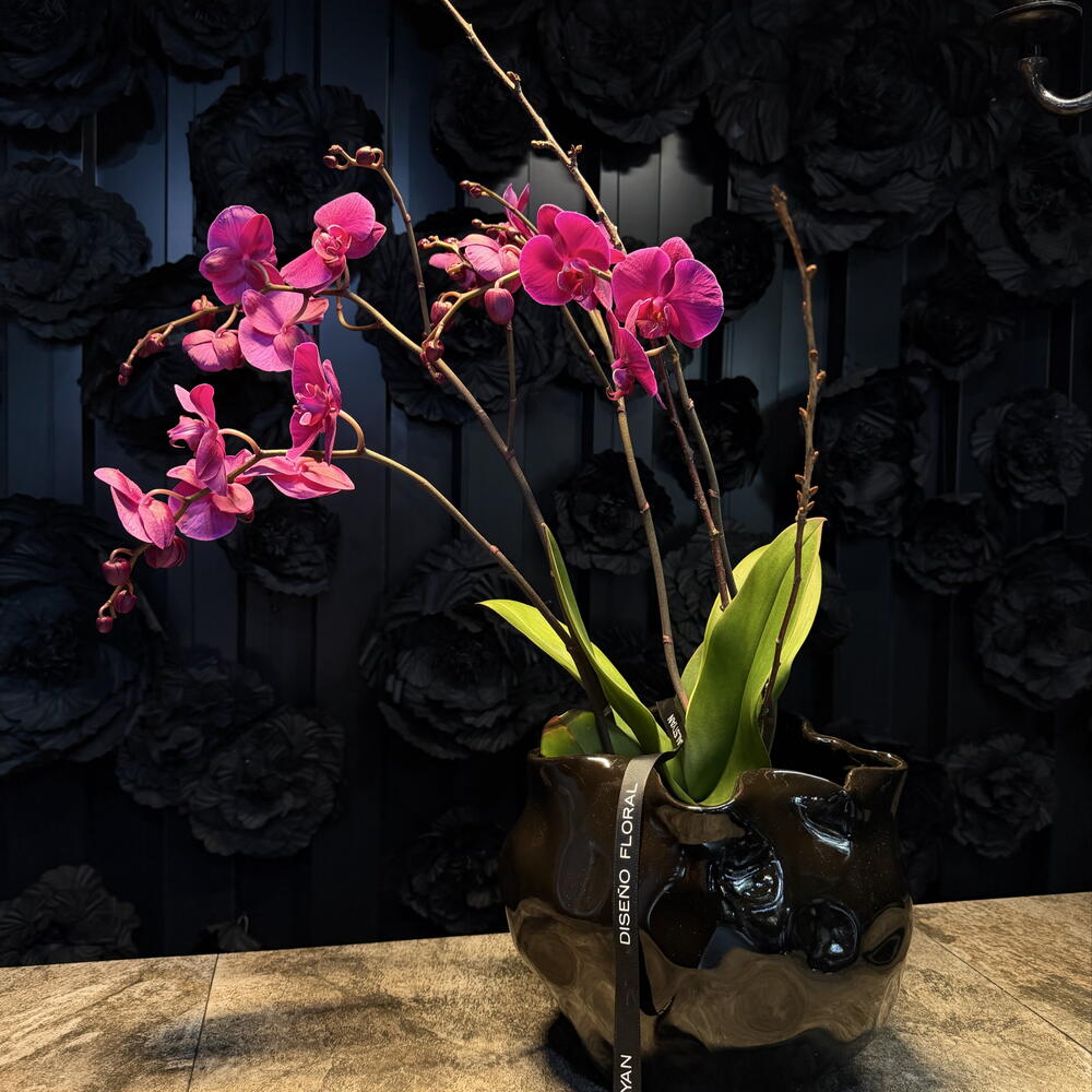 Orquídea Phalaenopsis, presentada de forma individua con un acabado limpio y elegante. Sus varas florales estilizadas combinan flores abiertas y capullos, creando una composición delicada y vertical. El verde brillante de las hojas equilibra el conjunto y realza el color vibrante de las flores, convirtiéndola en una pieza sofisticada, ideal para regalar o para aportar un toque refinado a cualquier espacio.