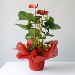 El Anthurium rojo es una planta exótica que destaca por sus brillantes flores rojas en forma de corazón y su follaje verde intenso. Este arreglo, presentado con un envoltorio rojo elegante, es ideal para aportar un toque de frescura y color vibrante a cualquier espacio. Perfecta para oficinas, salones o como un regalo que simboliza hospitalidad y amor duradero. Su fácil cuidado y su estilo tropical la convierten en una opción ideal para amantes de las plantas y decoraciones modernas.