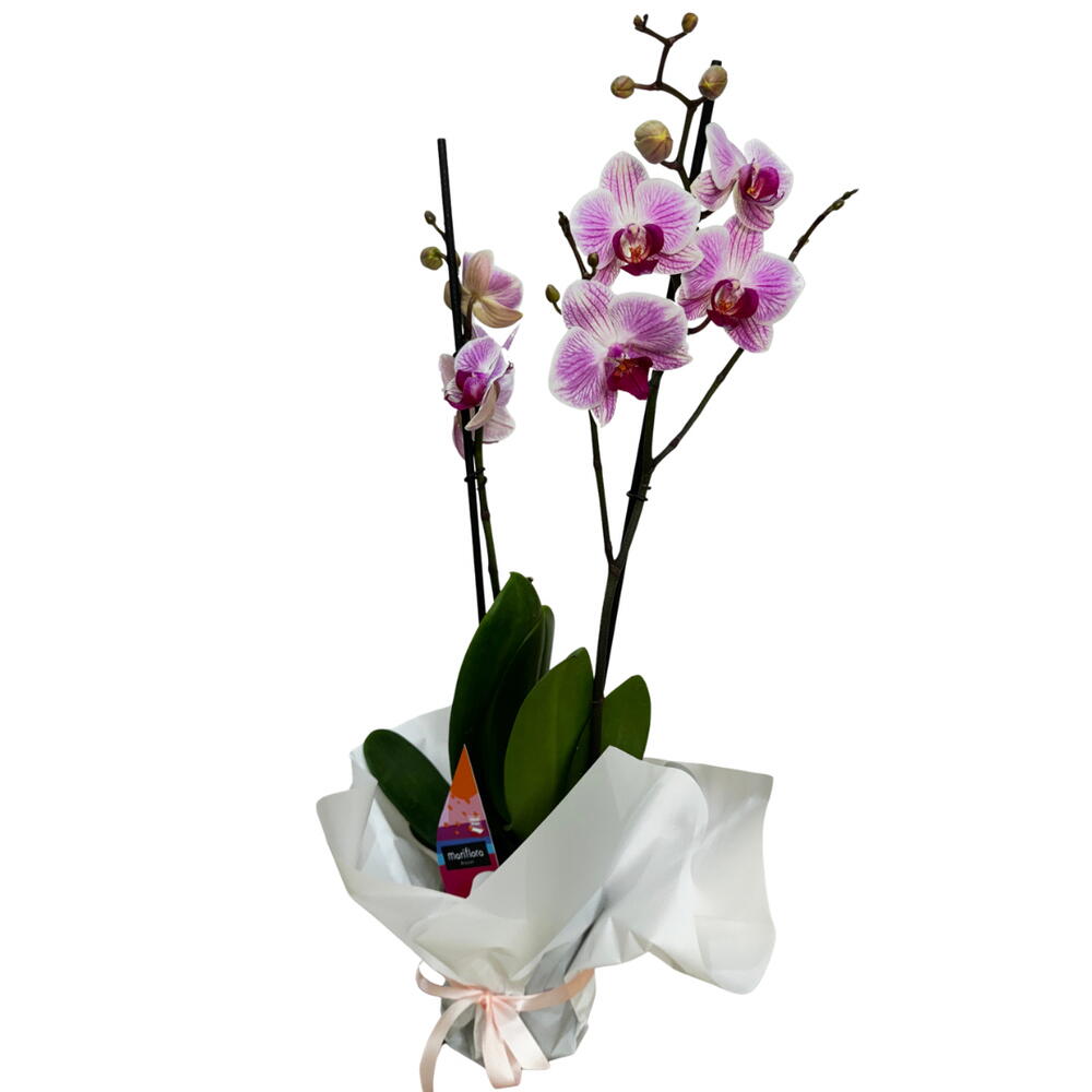 Planta natural de orquídea Phalaenopsis de 2 tallos con flores envuelta para regalo. No incluye macetero, si se quiere añadir por favor consultarnos por el chat de la aplicación.