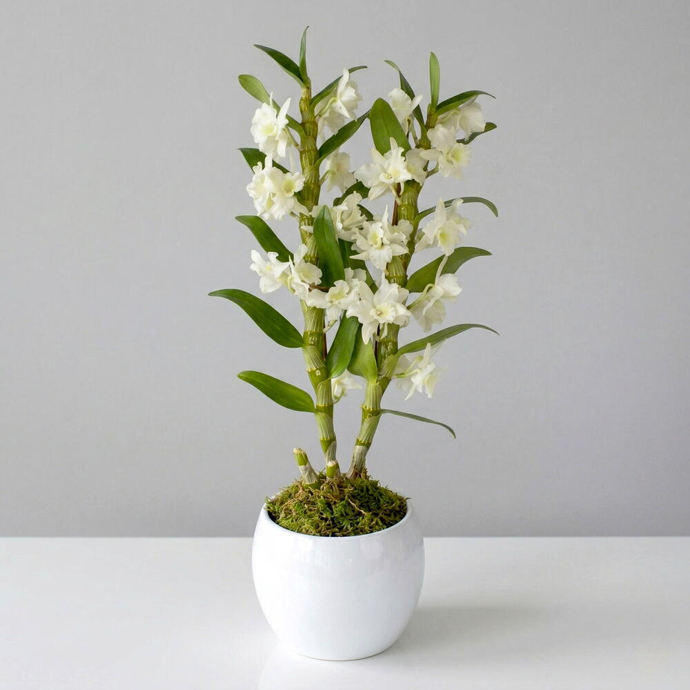 Una elegante orquídea dendrobium que simboliza la pureza y la serenidad. Sus delicadas flores blancas se presentan en un moderno macetero blanco, perfecto para cualquier espacio interior. Ideal para decorar oficinas, salones o regalar en ocasiones especiales como bodas o aniversarios. El contraste entre el verde vibrante de sus hojas y el blanco puro de sus flores la convierte en una pieza de decoración sofisticada y fresca. Un regalo que combina belleza natural con facilidad de cuidado.
