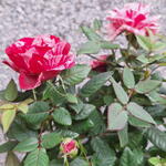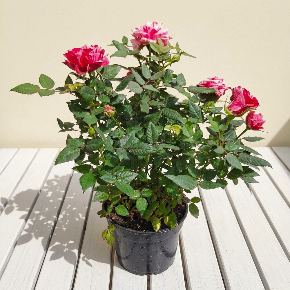 Este rosal mini destaca por sus llamativas flores jaspeadas en tonos fucsia y blanco crema. Es una planta compacta, ideal para balcones soleados. Requiere sol directo, riego frecuente manteniendo el sustrato húmedo y abono cada quince días en floración. Una opción vibrante y resistente para decorar exteriores.
