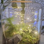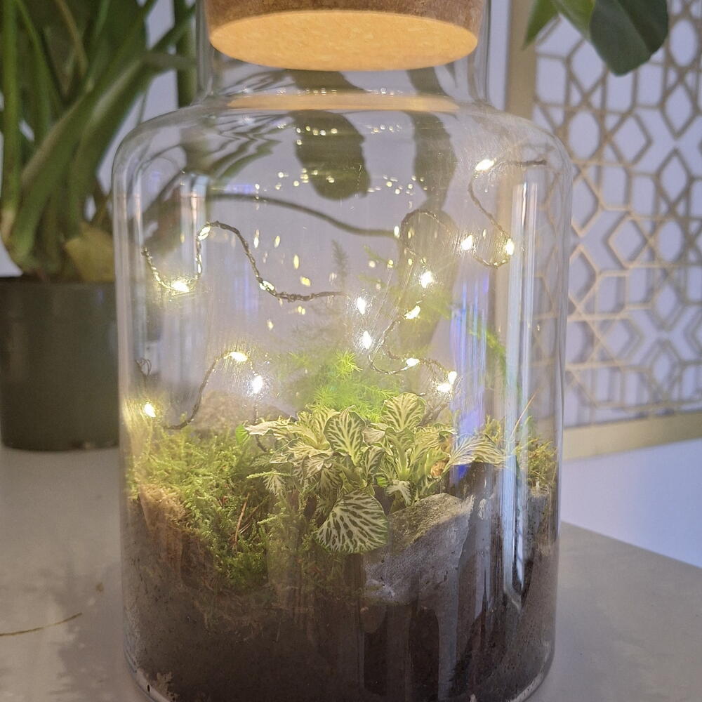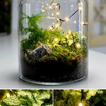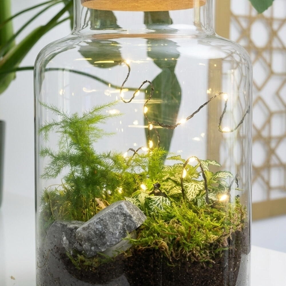 Terrario "Botanical Sanctuary" Una pieza decorativa elegante y única que lleva un trocito de la naturaleza a tu hogar. Este terrario artesanal, presentado en un frasco de vidrio de alta calidad, combina la frescura del musgo con la elegancia de un helecho espárrago y el llamativo patrón de hojas de la Fitonia. Incluye una cuerda de micro-LEDs de luz cálida que lo ilumina, convirtiéndolo en un acogedor punto focal tanto de día como de noche. Un regalo perfecto para los amantes de las plantas o para añadir un toque verde y moderno a cualquier espacio.