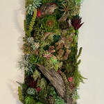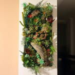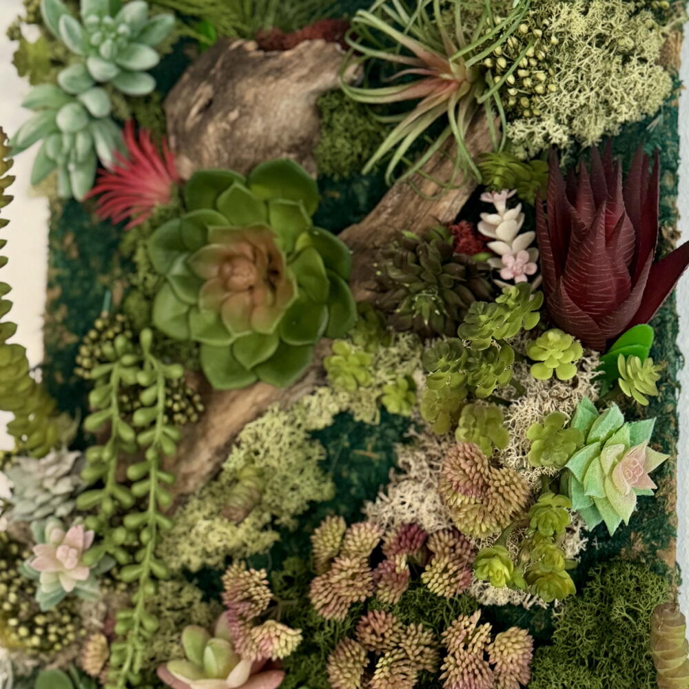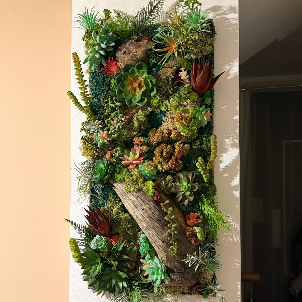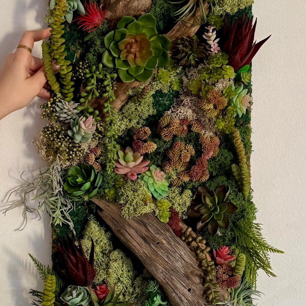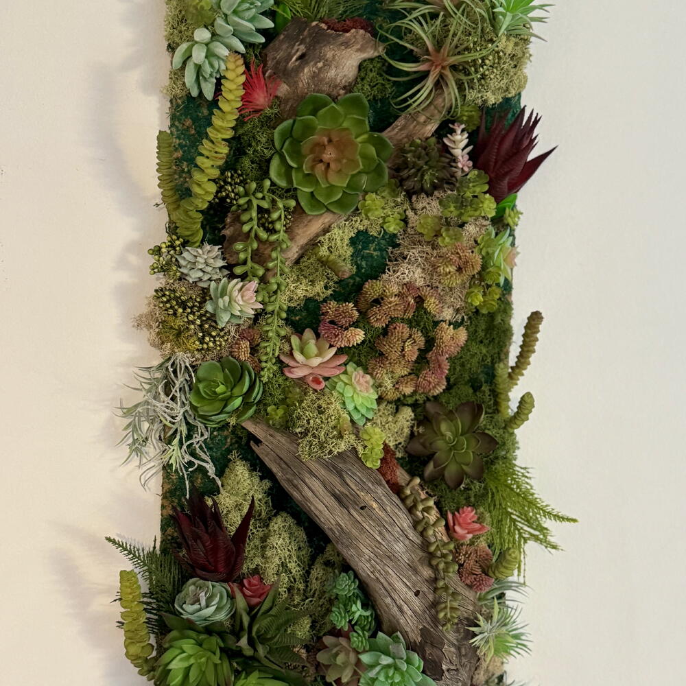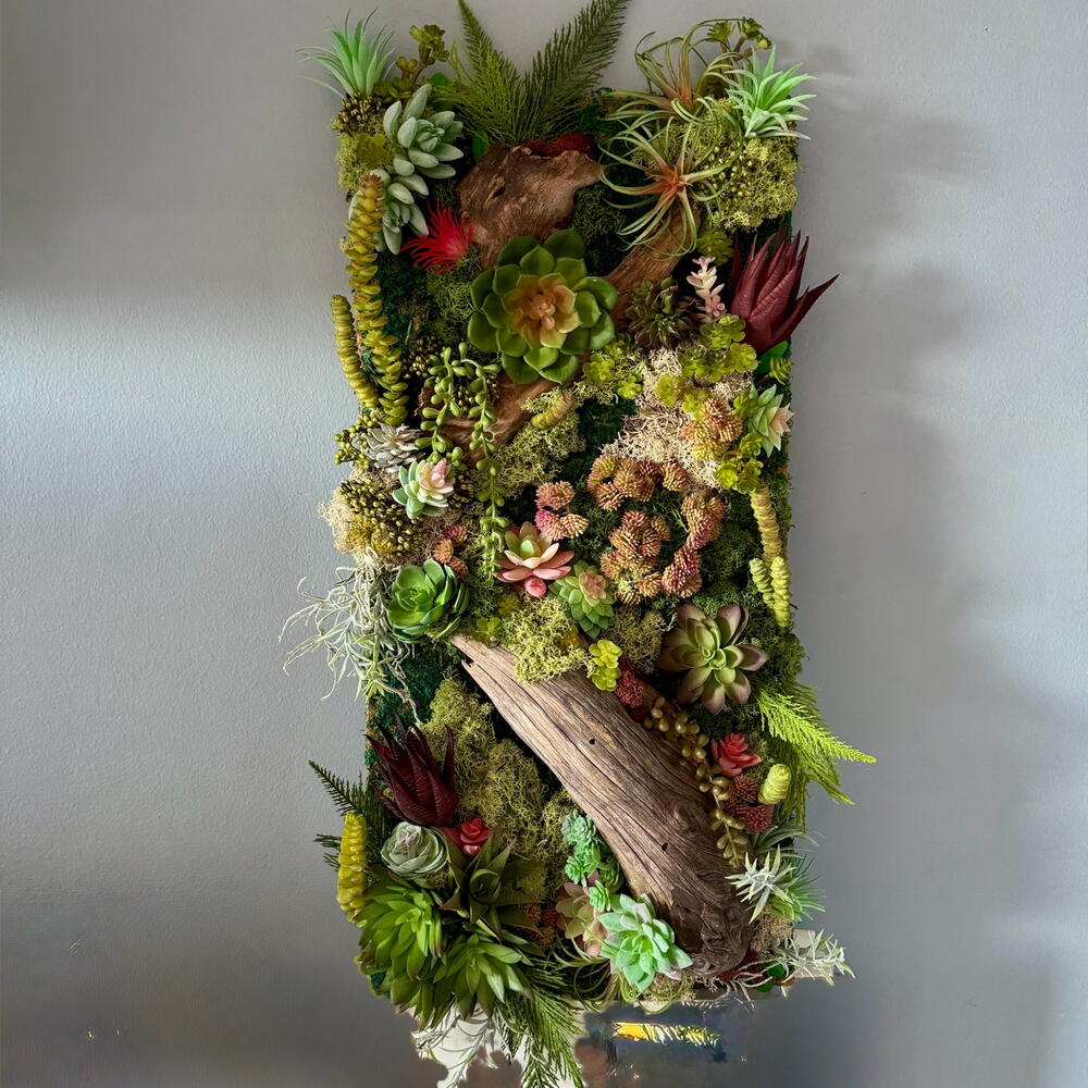 Panel vertical de jardín de suculentas, efecto 3D- marco de arte contemporáneo único, sin bordes, respaldo plano Musgo artificial y suculentas con piezas de madera de deriva natural