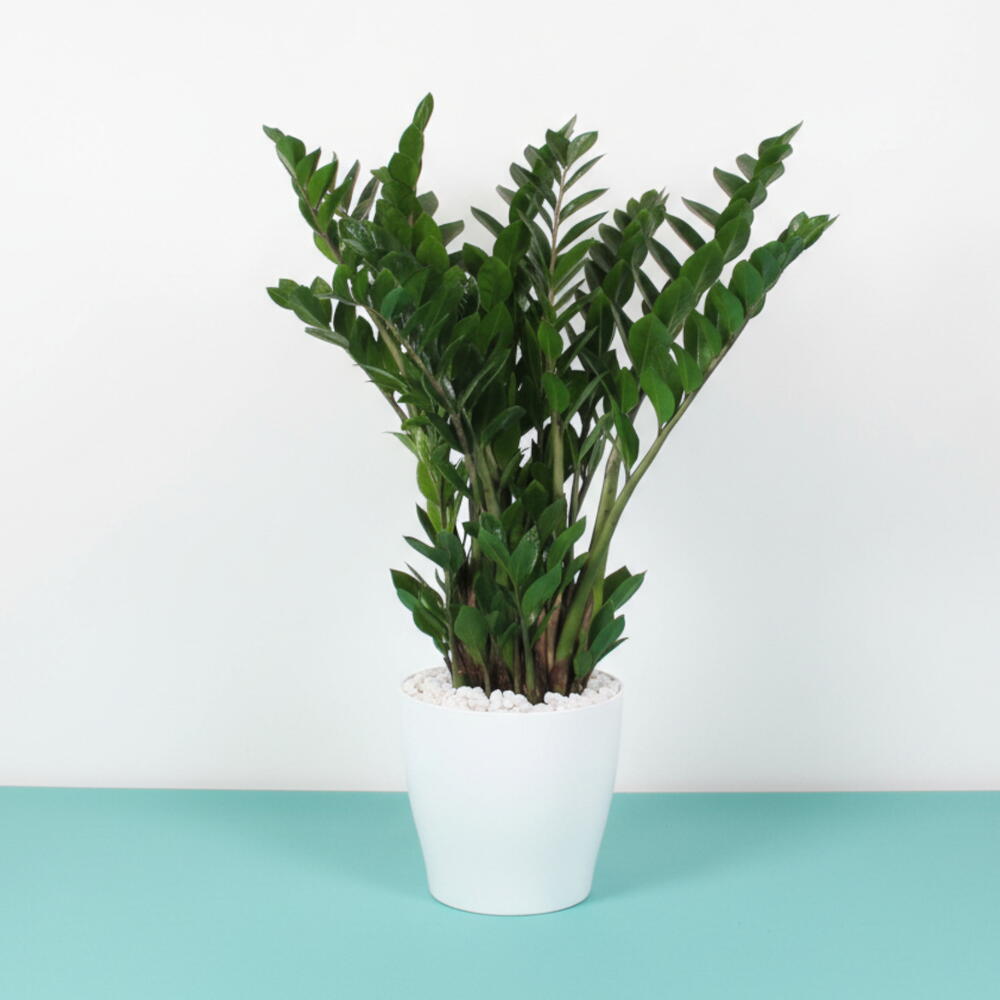 La Zamioculca (Zamioculcas zamiifolia) es una planta de interior resistente y muy decorativa, con hojas brillantes de color verde oscuro. Se presenta en una maceta blanca con cobertura de piedras blancas decorativas, ideal para ambientes modernos y minimalistas.