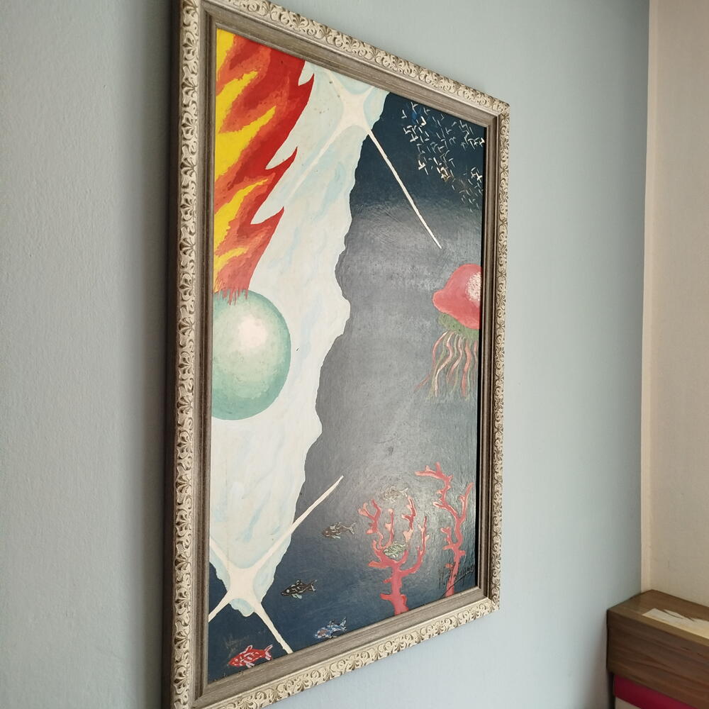 Эта прекрасная работа в стиле символизма, искусно выполненная акриловыми красками на панели, отражает глубину и сложность этого художественного течения. Изящная и искусная рама из полихромного дерева добавляет картине изысканности и подчёркивает её истинную красоту. Настоящее художественное сокровище, которое привнесёт изысканную эстетику и очарование в любое пространство.