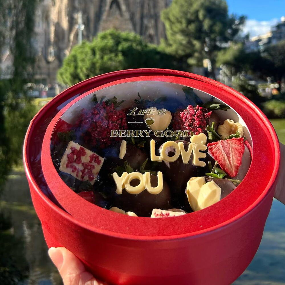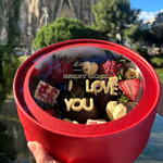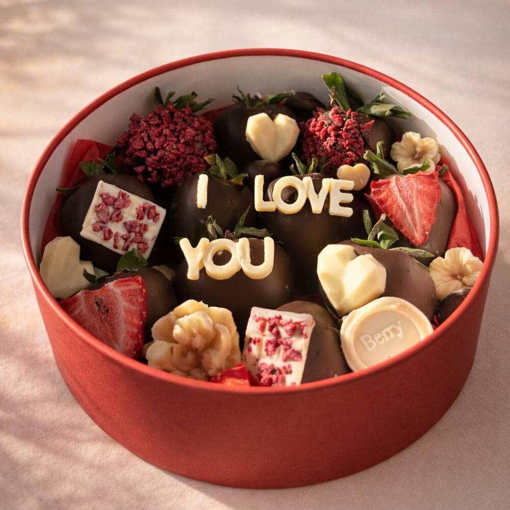 Небольшая, интенсивная и попадающая прямо в сердце. Berry Love Whisper Box — наша круглая мини-коробочка с 12 клубниками (в зависимости от калибра), покрытыми шоколадом, украшенная романтическими деталями и надписью «I LOVE YOU» в центре. Это идеальный подарок на День святого Валентина, когда хочешь сказать это ясно в компактном, элегантном и очень подходящем для подарка формате. Важно: в наших мини-коробках шоколадное покрытие клубники выполняется из одного вида шоколада (без смешивания). В этом дизайне покрытие — молочный шоколад; украшения могут быть в других тонах для создания контраста. 100 % настраиваемо: сообщение, стиль, топпинги и общая эстетика по твоему вкусу. И, конечно, всё без глютена.