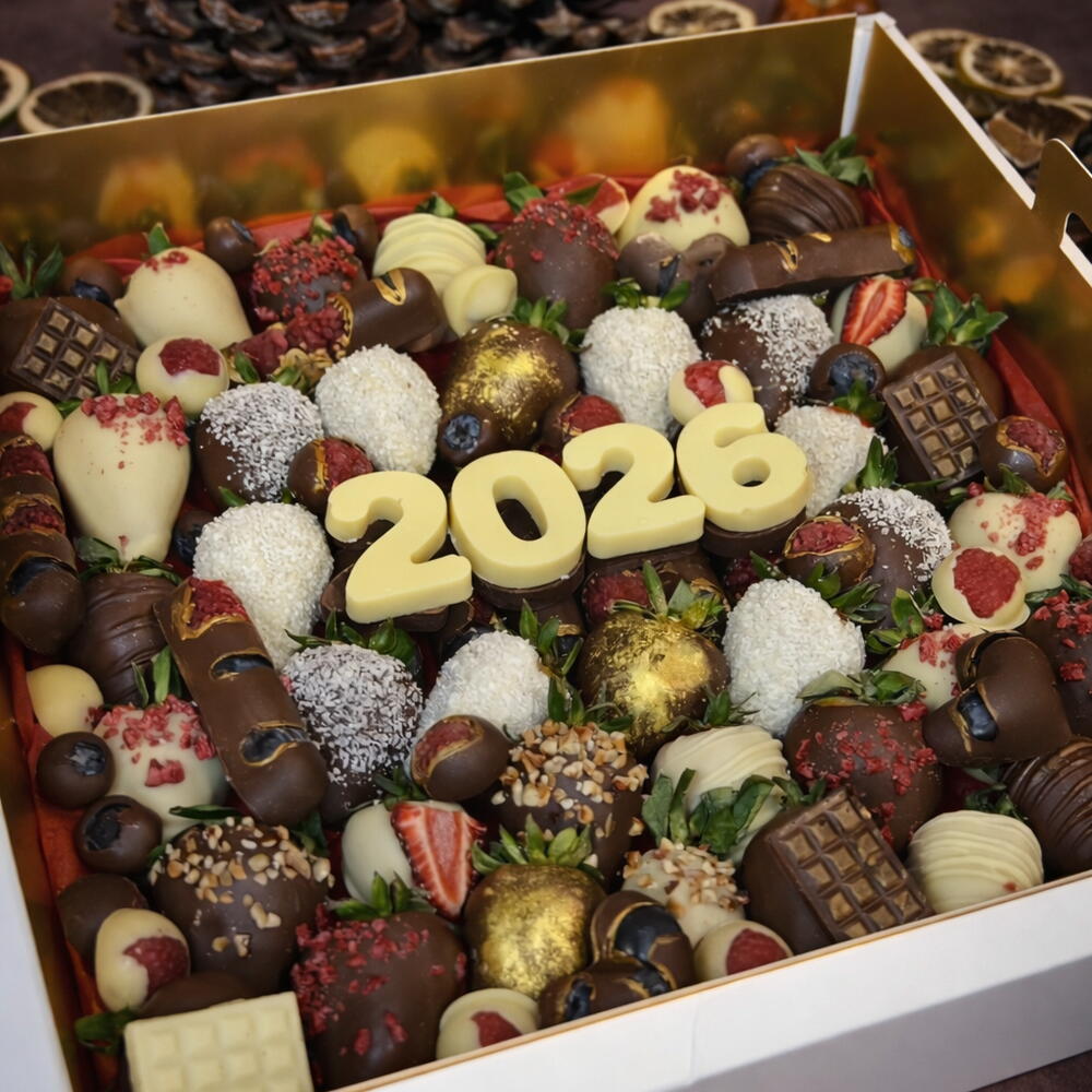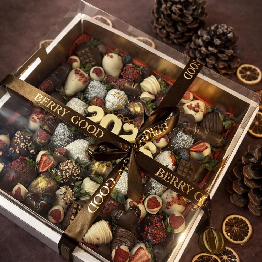 Большая коробка, которая говорит обо всём, не говоря слишком много. Berry Grand Signature — наш квадратный формат 30 × 30 см с примерно 45 клубниками, политых разными видами шоколада, в сочетании с ягодами и топпингами для потрясающего микса текстур (хрустящий, кремовый, фруктовый). Центр полностью персонализируется: имя, инициалы, возраст, дата или короткая фраза (типа «TE AMO», «I LOVE YOU», «BE MY VALENTINE»…). И как всегда, 100 % настраиваемый: вы выбираете палитру цветов (классический красный, розовый, black gold…), тип шоколада и стиль (minimal vs. full toppings). Количество клубник ориентировочно в зависимости от калибра. И, разумеется, всё без глютена.