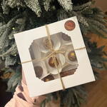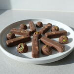Трюфели ручной работы из молочного шоколада с начинкой: 6 шт. (около 12 г каждая) Батончики пралине в шоколадной глазури: 2 шт. (около 20 г каждая) Премиальный молочный шоколад: 90 г Тёмный шоколад: 20 г Фисташковое пралине: 25 г Сливки (крем из молока): 18 г Сахар: 15 г Какао-масло: 10 г Натуральные дроблёные фисташки: 6 г Съедобное сусальное золото: 0,06 г