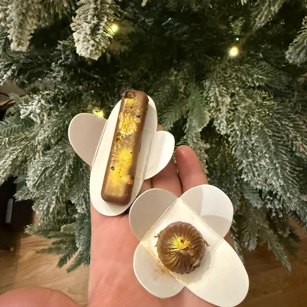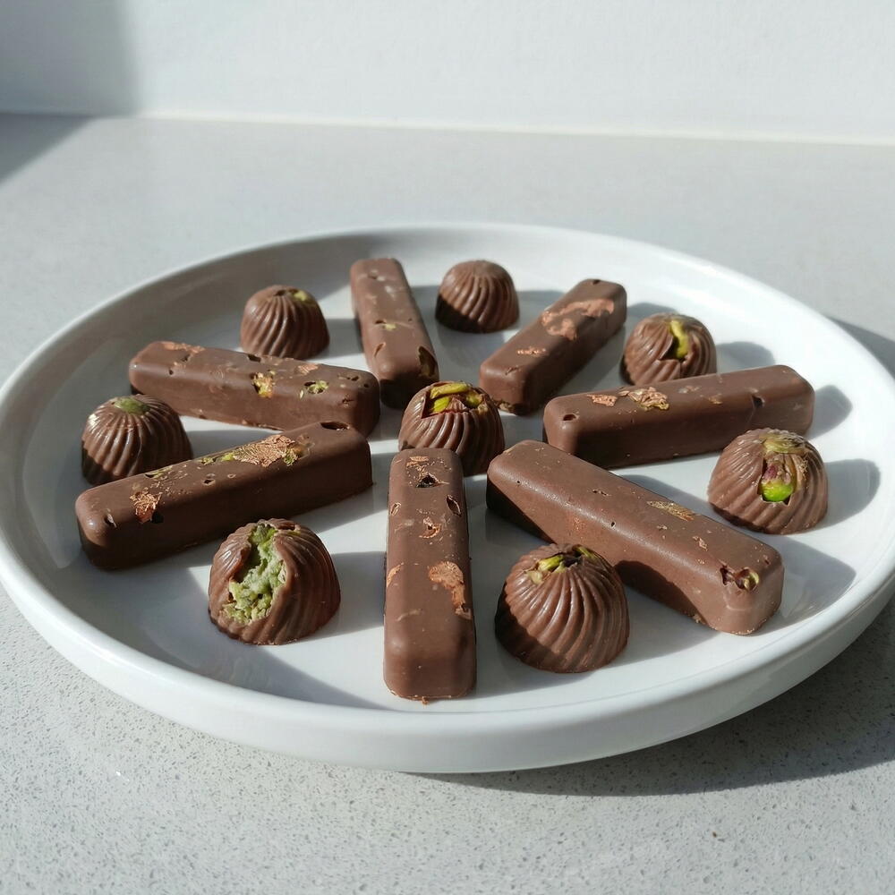 Гурманская коробка ручных шоколадных конфет с фисташкой и съедобным золотым листом — это изысканная подборка, созданная для любителей тонкого шоколада и элегантных подарков. Эта тщательно оформленная коробка включает гармоничное сочетание ручных трюфелей из молочного шоколада, деликатно начинённых и украшенных натуральной фисташкой, а также плиток шоколада пралине, покрытых тонким съедобным золотом. Каждое изделие изготовлено вручную, подчёркивая мягкую текстуру, баланс вкусов и минималистичную, утончённую подачу. Идеальна для премиальных подарков, особых праздников, эксклюзивных сладких столов или в качестве гастрономического подарка для памятных случаев, эта коробка передаёт роскошь, мастерскую заботу и удовольствие в каждом кусочке.