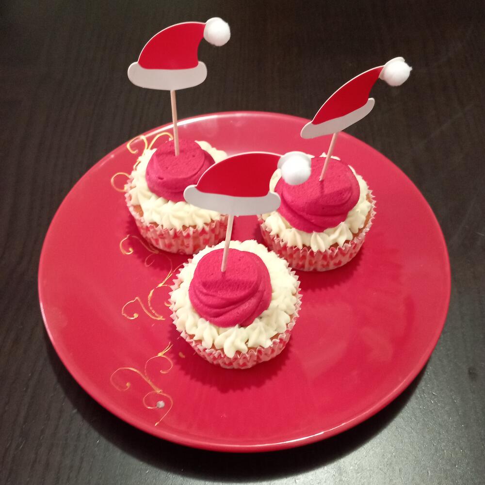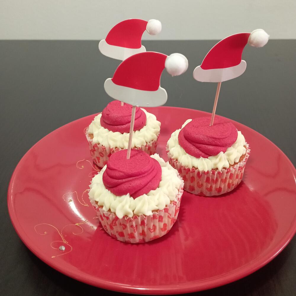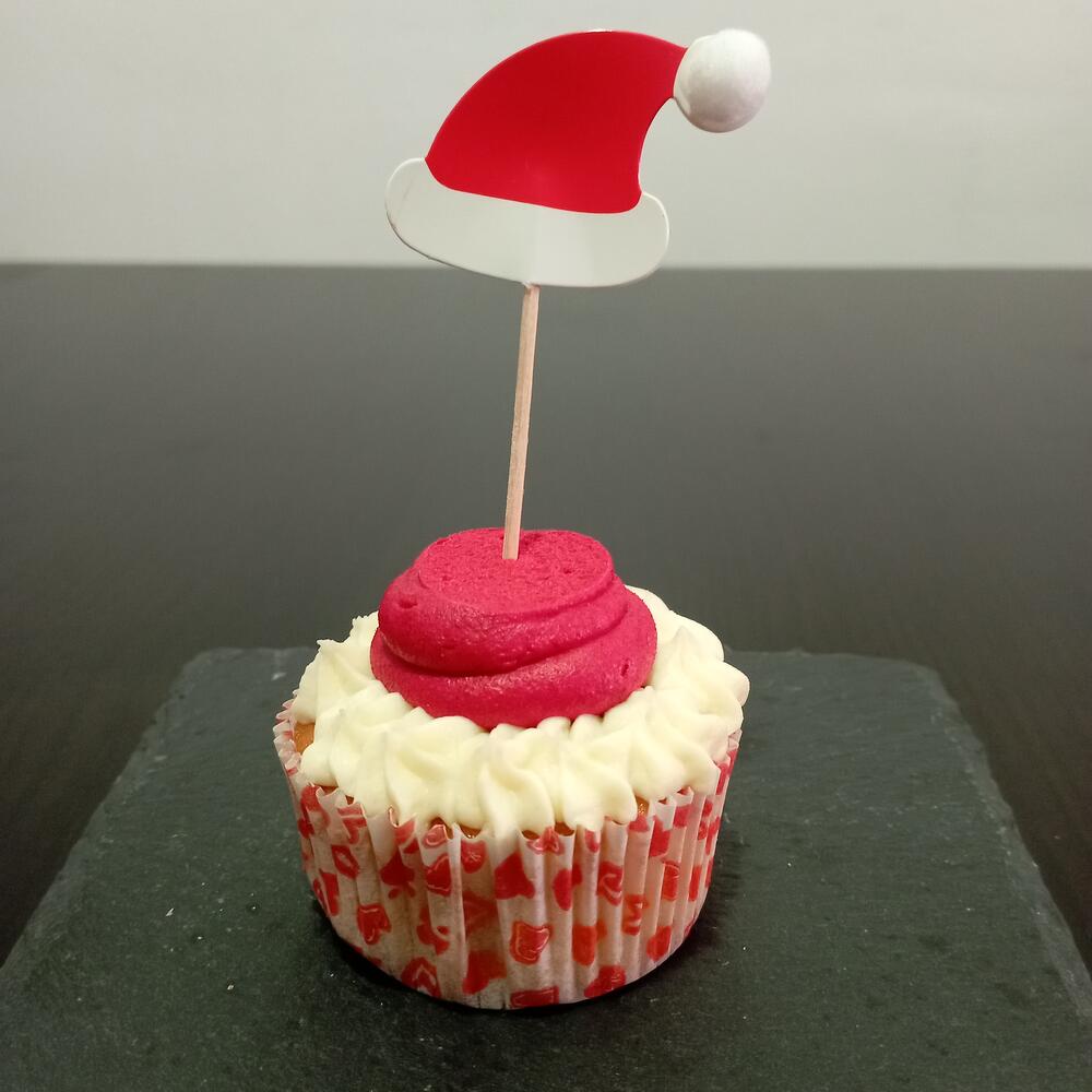 Откройте для себя деликатную и нежную текстуру наших капкейков, созданных с особой заботой и из ингредиентов высочайшего качества. Приготовлены из муки, сахара, сливочного масла и свежих яиц. Пышный ванильный бисквит с кремовым и мягким двухцветным ванильным баттеркремом и украшением в виде Санта-Клауса. Для любителей капкейков — взрыв вкуса в каждом укусе. Идеально для сладкого Рождества. Попробуйте сегодня!