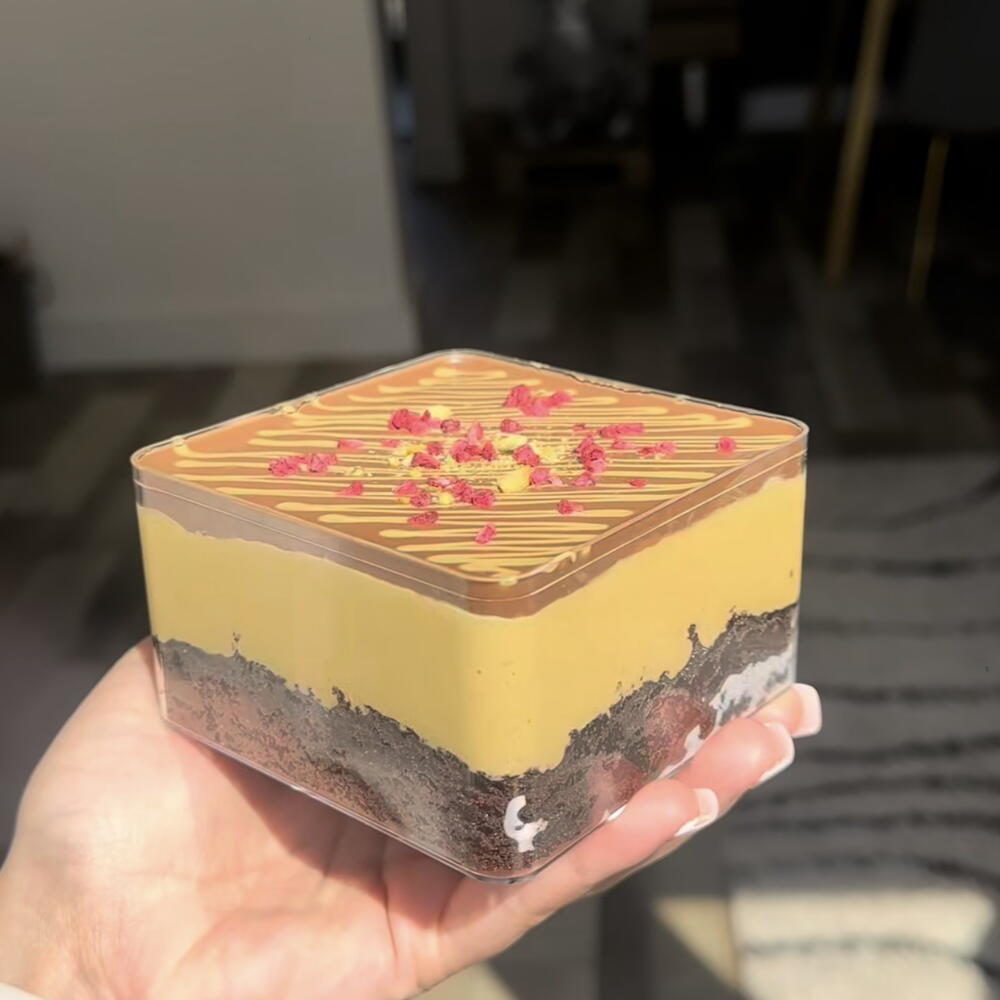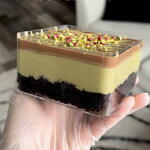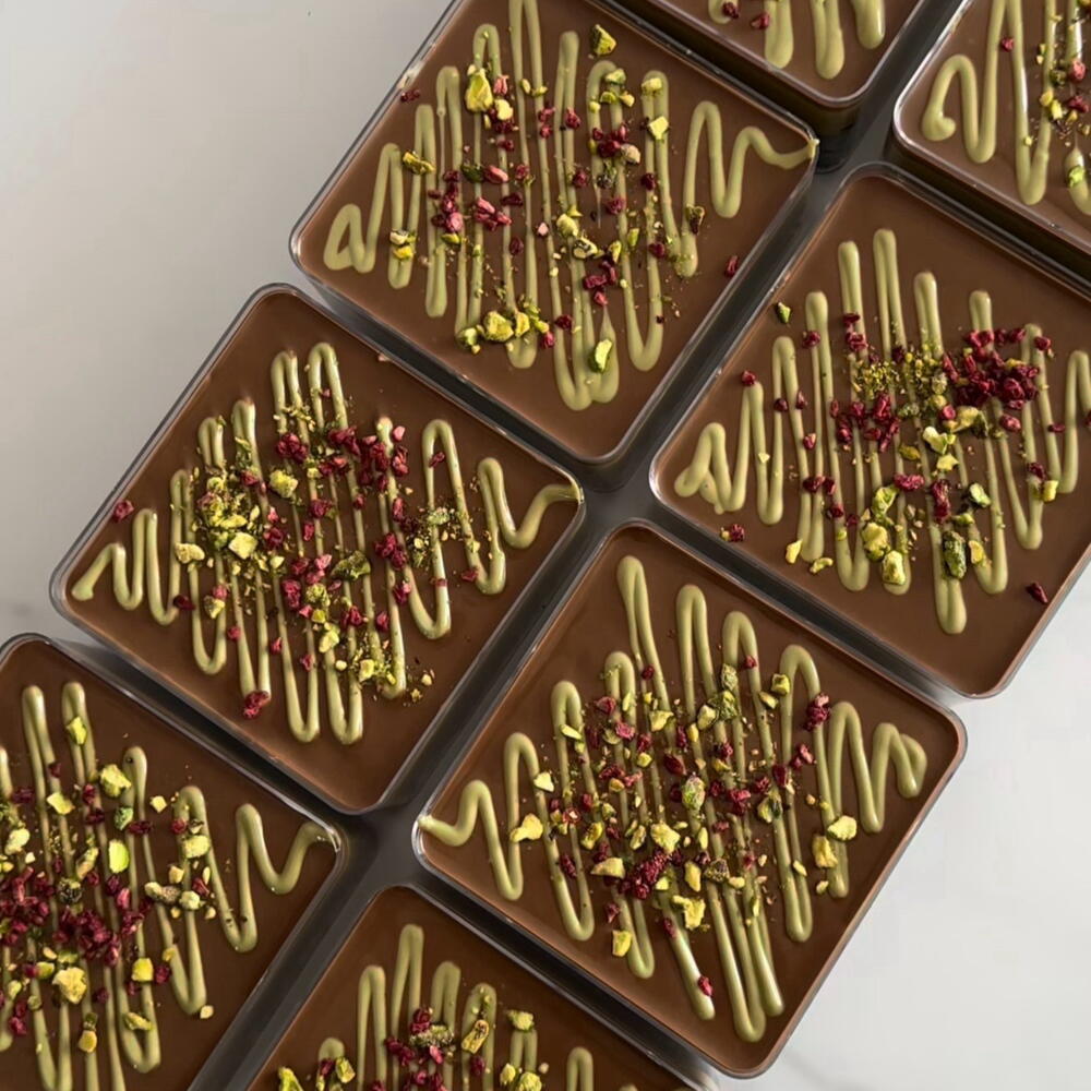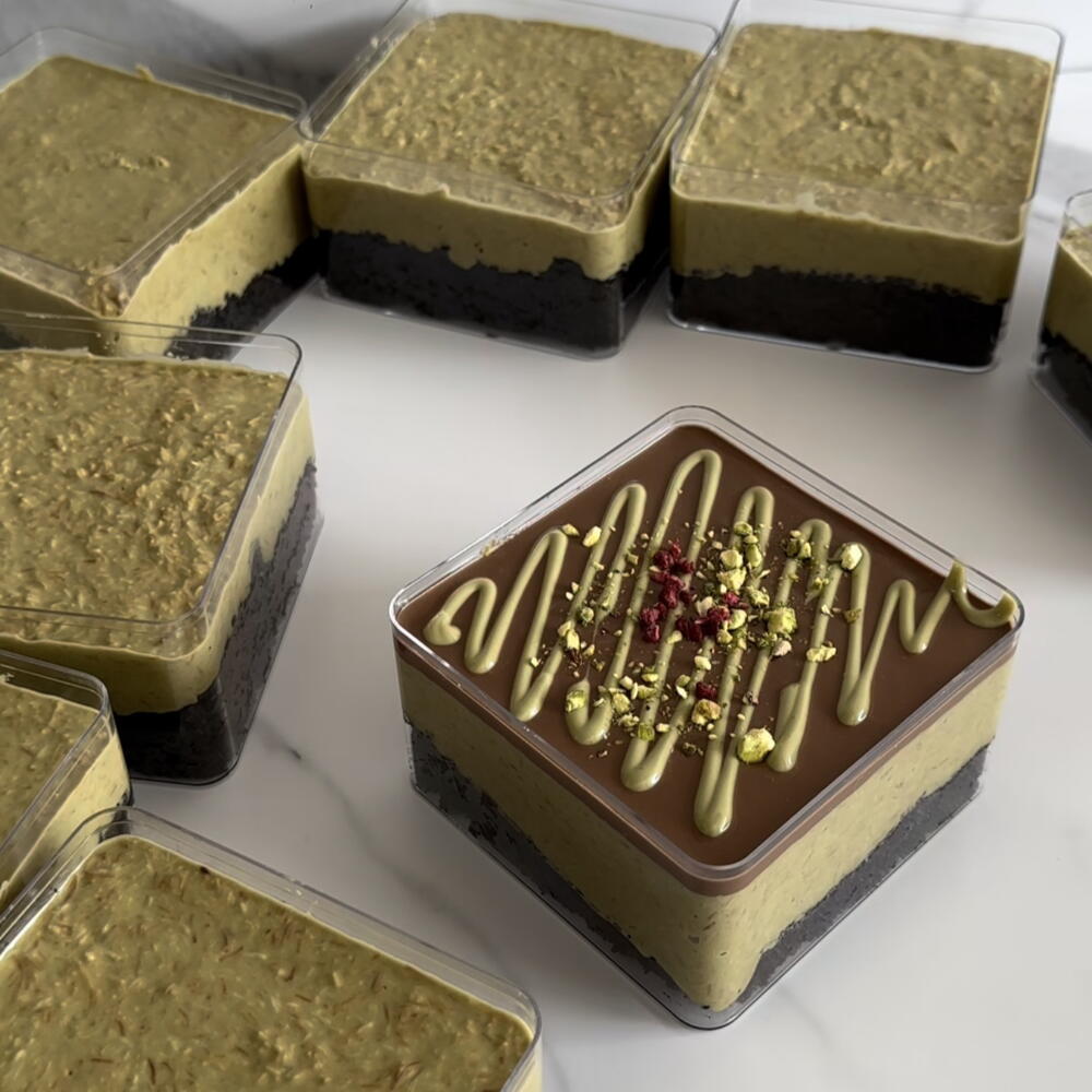 Cada vasito está compuesto por tres capas perfectamente equilibradas: • En la base, un bizcocho de chocolate suave y aromático, delicado y esponjoso. • En el centro, una crema de pistacho con kataifi, inspirada en el estilo de los postres de Dubái, con una textura cremosa y un ligero toque crujiente. • En la parte superior, un ganache de chocolate belga, intenso y sedoso, que aporta un acabado elegante y lleno de sabor El resultado es un postre con contraste de texturas y un sabor refinado, donde el pistacho y el chocolate se combinan de manera armoniosa. Recomendaciones: conservar en frío y consumir en 24–48 horas para mantener su frescura y mejor textura
