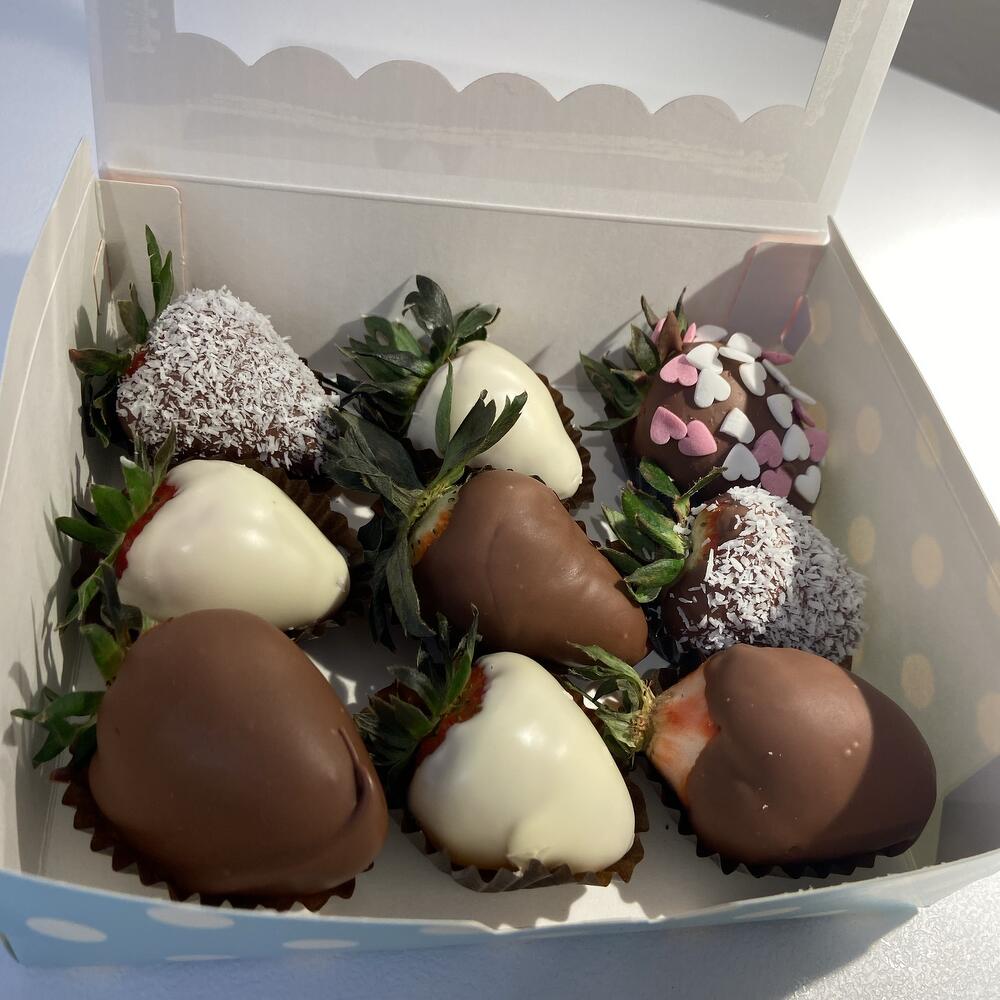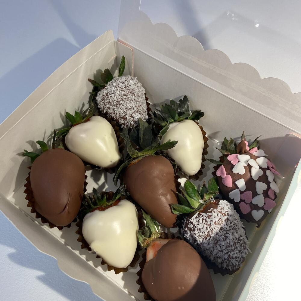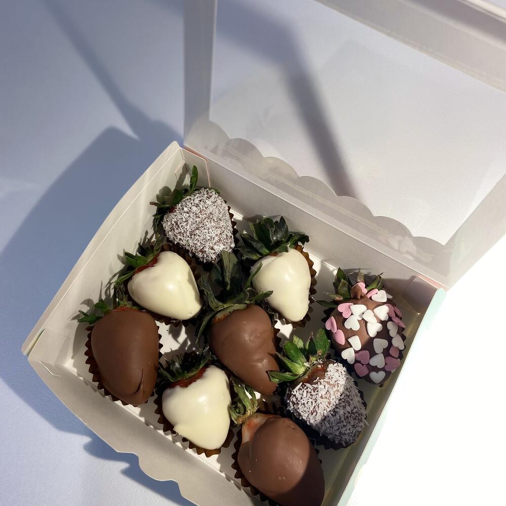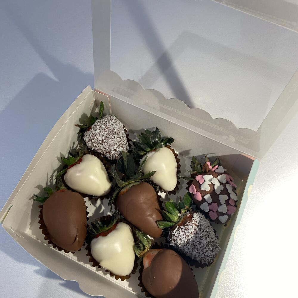 Caja de regalo con fresas en chocolate 9 fresas seleccionadas Fresas frescas, maduras y cuidadosamente seleccionadas. Cubiertas con chocolate belga con leche Ingredientes: azúcar, manteca de cacao, leche entera en polvo, pasta de cacao, emulsionante (lecitina de soja). Presentación elegante Caja de regalo con tapa transparente: ideal para un detalle dulce y delicado.