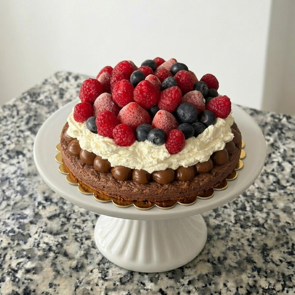 Шоколадный брауни с дульсе-де-лече, взбитыми сливками и красными ягодами. Хранить в холодильнике до употребления. 26 см, от 12 до 16 порций