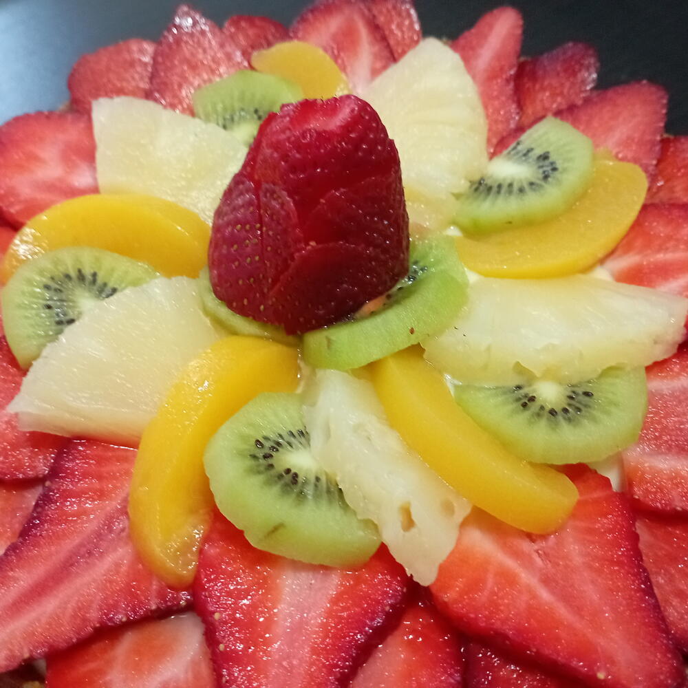 Harina, azúcar, mantequilla, almendras, huevos, maicena,leche, fruta (melocotón ?, piña,fresas, kiwi ?)