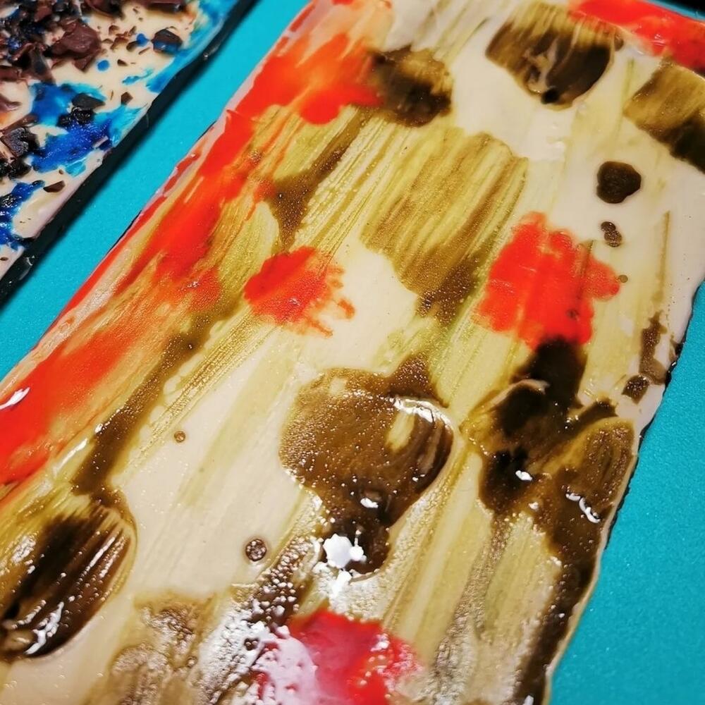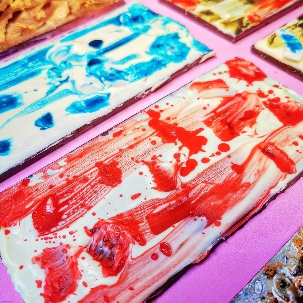 4 dark chocolate bars (70% cocoa) with a white chocolate layer above handmade painted. This painting is totally handmade. Therefore, each piece is exclusive and different from the others.