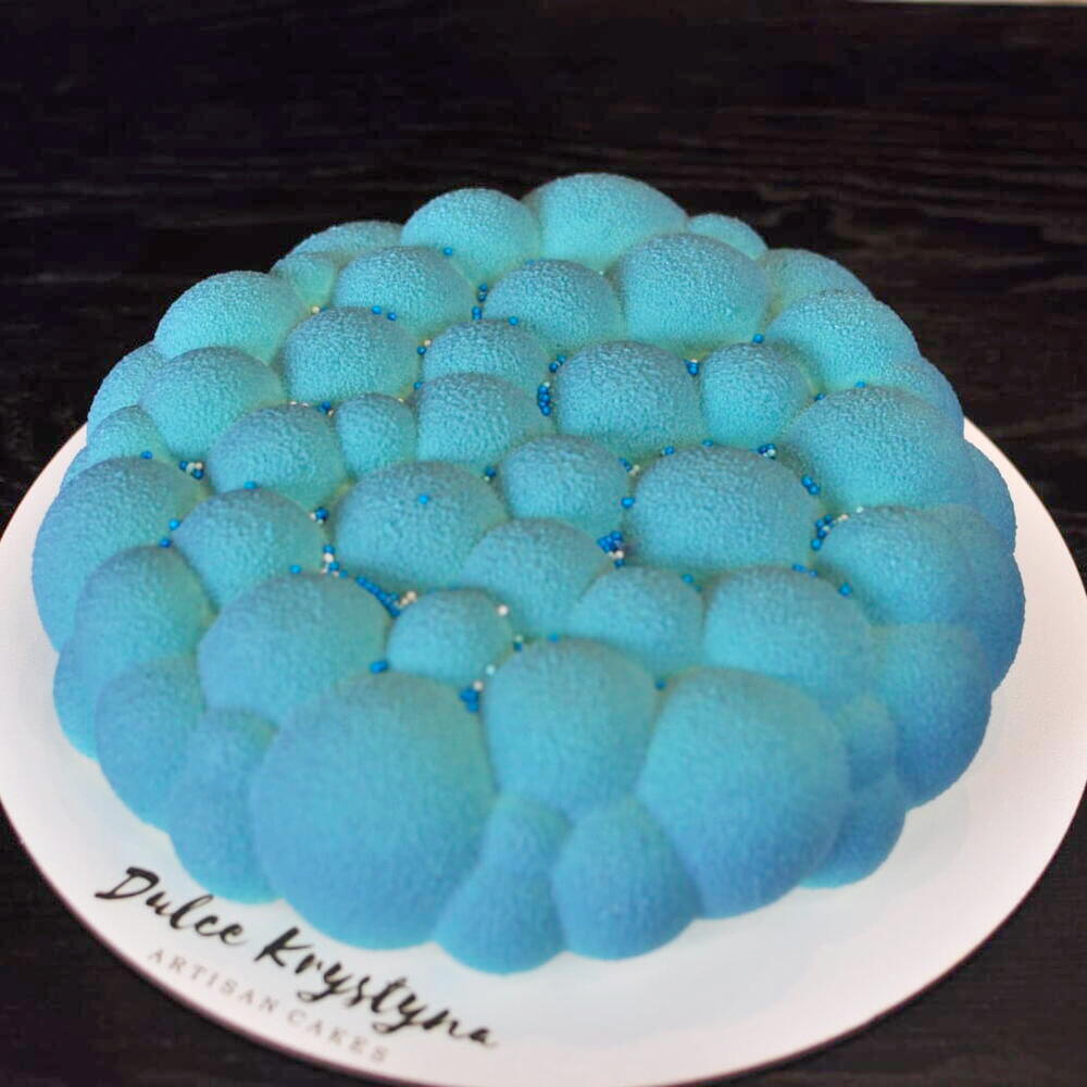 Tarta moderna de mousse con forma de burbujas, recubierta con un efecto aterciopelado en tonos azules degradados. Decorada con pequeñas perlas comestibles que aportan brillo y textura. Interior suave y delicado, perfecta para celebraciones especiales o como un detalle elegante. Diseño contemporáneo y llamativo.