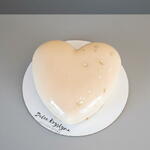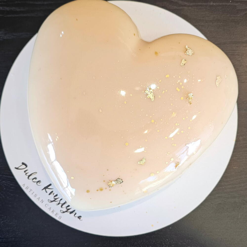 Tarta mousse en forma de corazón con acabado efecto espejo en tono nacarado, decorada con suaves salpicaduras doradas y detalles de pan de oro. Un diseño elegante, minimalista y romántico, perfecto para celebraciones especiales. El interior se elabora artesanalmente con capas cremosas y textura ligera.
