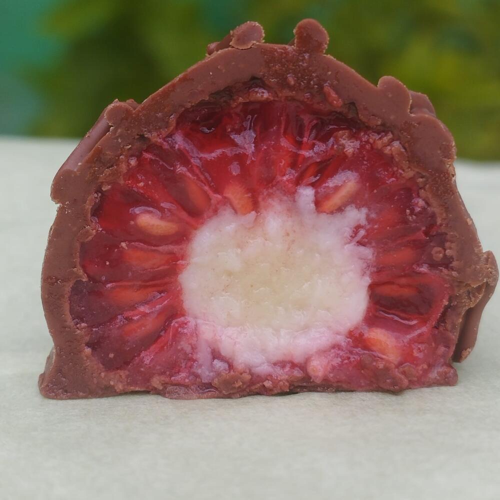 frambuesas frescas, chocolate con leche (azúcar, manteca de cacao, leche en polvo, pasta de cacao, lecitina de soya, aroma natural de vainilla), crema de coco (pulpa de coco, leche condensada, manteca de coco)