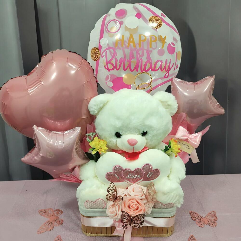 Отпразднуйте день рождения нежно и элегантно с нашей композицией «Медведь с днем рождения». Этот подарок включает в себя очаровательного большого плюшевого мишку и четыре персонализированных фольгированных шара в розовых и золотых тонах: круглый шар с надписью «С днем рождения», два шара в форме звезд и один шар в форме сердца. Вся композиция упакована в декоративную корзину с искусственными цветами, декоративными бабочками и большим розовым бантом, который завершает этот незабываемый сюрприз. Инструкция по уходу: Храните композицию в прохладном, сухом месте, вдали от источников тепла и прямых солнечных лучей, чтобы сохранить плюшевого мишку, шары и декоративные элементы в хорошем состоянии. Избегайте контакта с жидкостями, чтобы сохранить блеск и форму композиции. Идеально подходит для подарка в первозданном виде, не требуя дополнительного ухода.