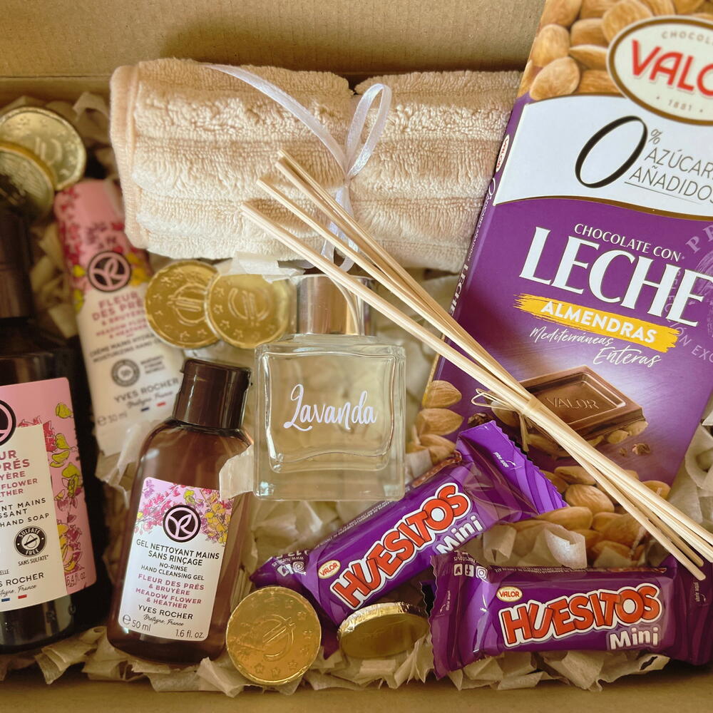 1 жидкое мыло для рук Yves Rocher 190 мл 1 крем для рук Yves Rocher 30 мл 1 гель для рук без смывания Yves Rocher 50 мл 1 полотенце для рук 1 ароматический диффузор 2 мини Huesitos 1 плитка шоколада с миндалём Valor