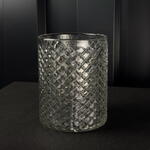Jarrón de vidrio tallado con diseño en espiral, elegante y moderno, ideal para velas o pequeños arreglos florales.