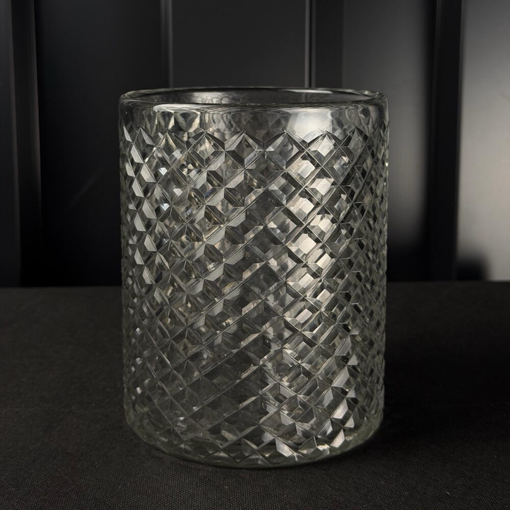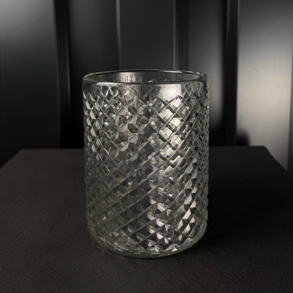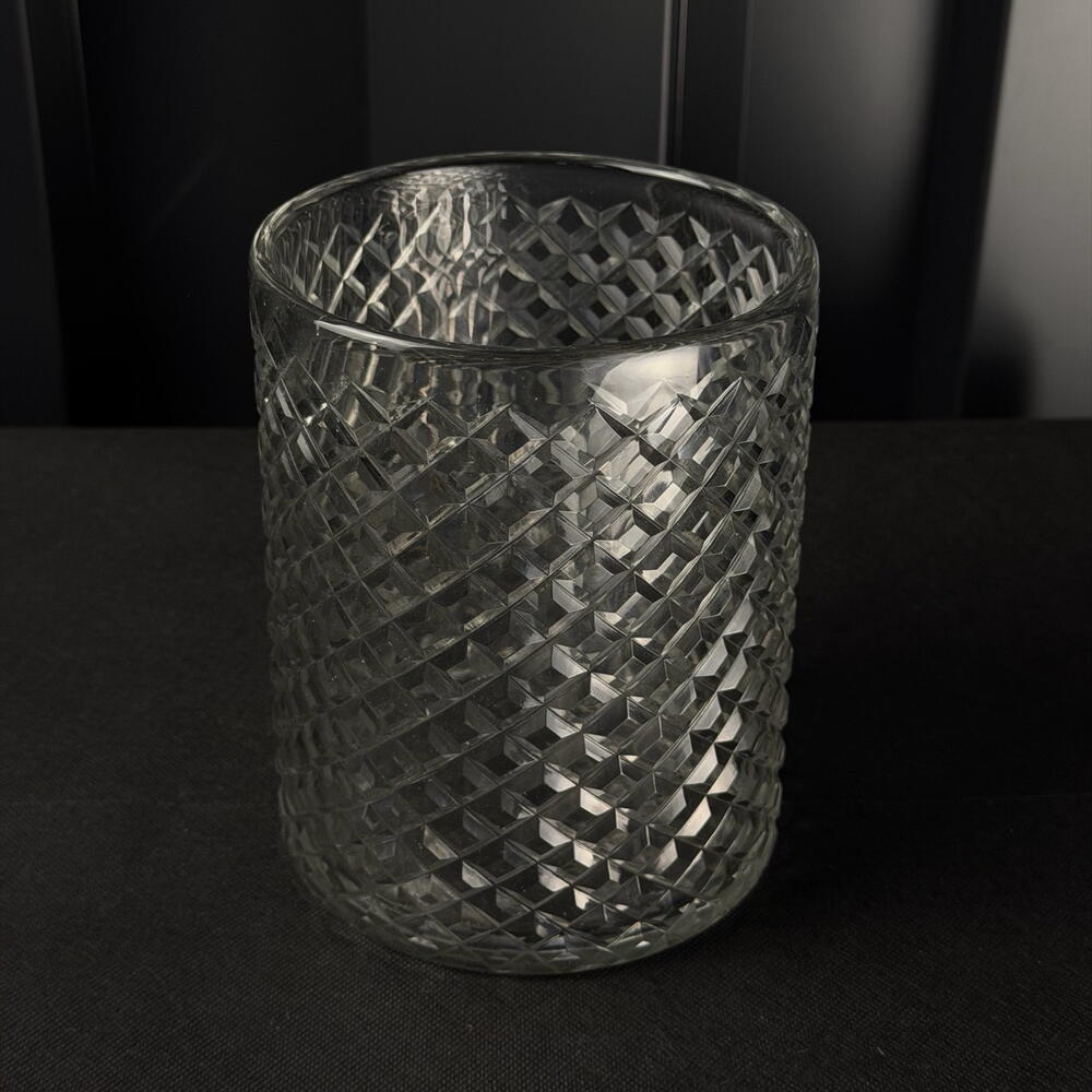 Jarrón de vidrio tallado con diseño en espiral, elegante y moderno, ideal para velas o pequeños arreglos florales.